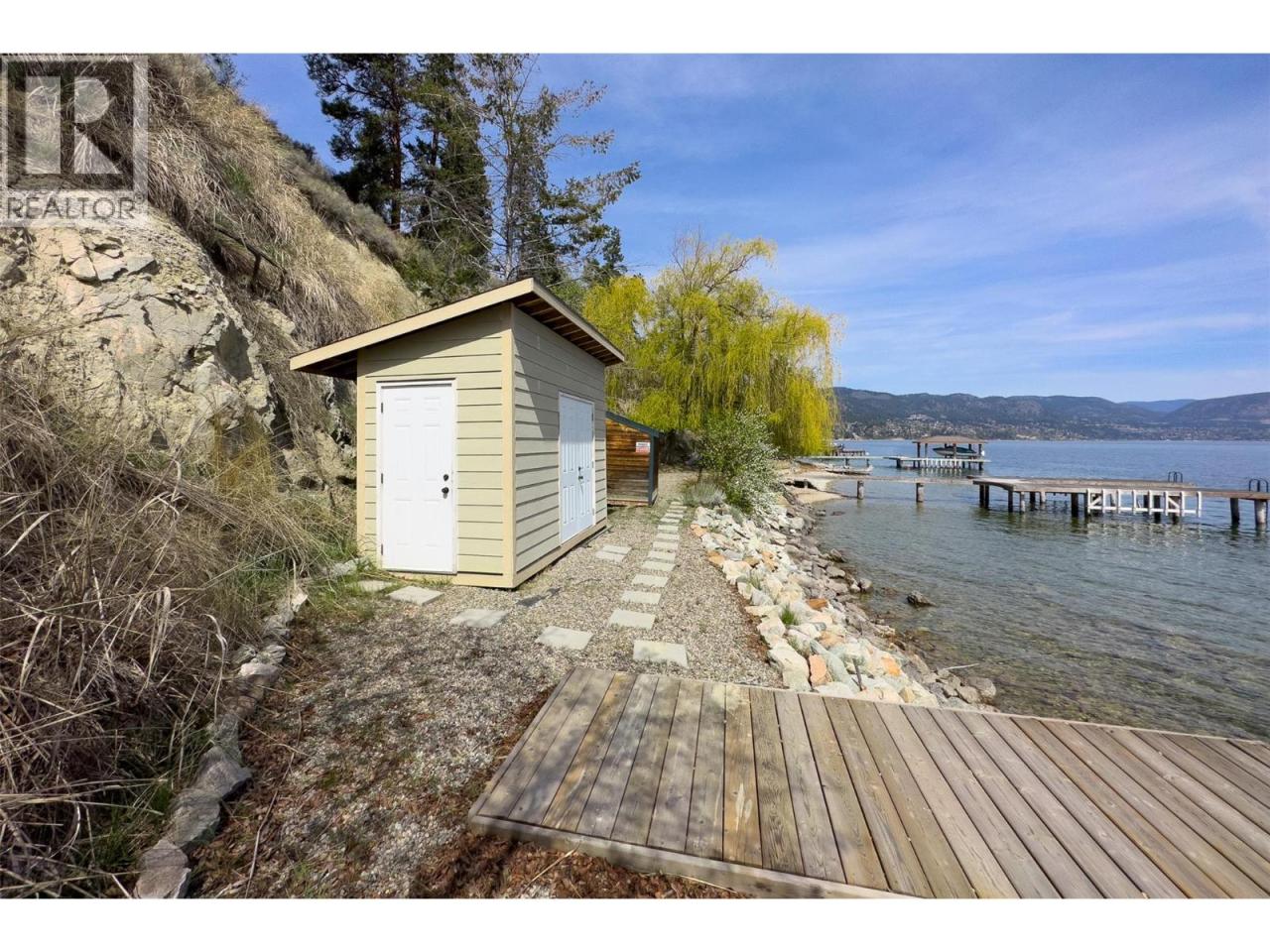 This Peachland waterfront retreat is perfectly perched along the sun-kissed west shores of Okanagan Lake and is located outside the speculation tax zone! Enjoy 80ft of private shoreline featuring a massive dock w/3-ton boat lift, dual Sea-Doo lift, beachside storage hut & lots of space to lounge in the sunshine. Enjoy boating to downtown Peachland (10min away) or cruising across to the Hotel Eldorado for lunch in under 30 minutes! It's truly the best of the best when it comes to Okanagan living! Designed to take in the breathtaking lake views, this walk-out rancher is crafted with natural materials blending rustic charm with effortless modern comfort. The open-concept main level opens to a wrap-around deck...perfect for dining alfresco & sunset cocktails. Inside, living & dining spaces flow into the kitchen creating the perfect setting for gathering with family & friends. Downstairs, the walk-out level is built for entertainment, the spacious family/games room opens directly to a partially covered patio and lake-view hot tub, an ideal spot for star-gazing after a day on the water. Complete with radiant in-floor heat, for year-round comfort and wall-to-wall windows this lower level hosts 2 primary suites, 2 additional guest bdrms, a den and laundry facilities...plenty of space for everyone to relax, reconnect and make lasting memories. The property also includes an oversized double garage & RV parking. A picture perfect Okanagan retreat—this is lakeside living at its finest. (id:6769)