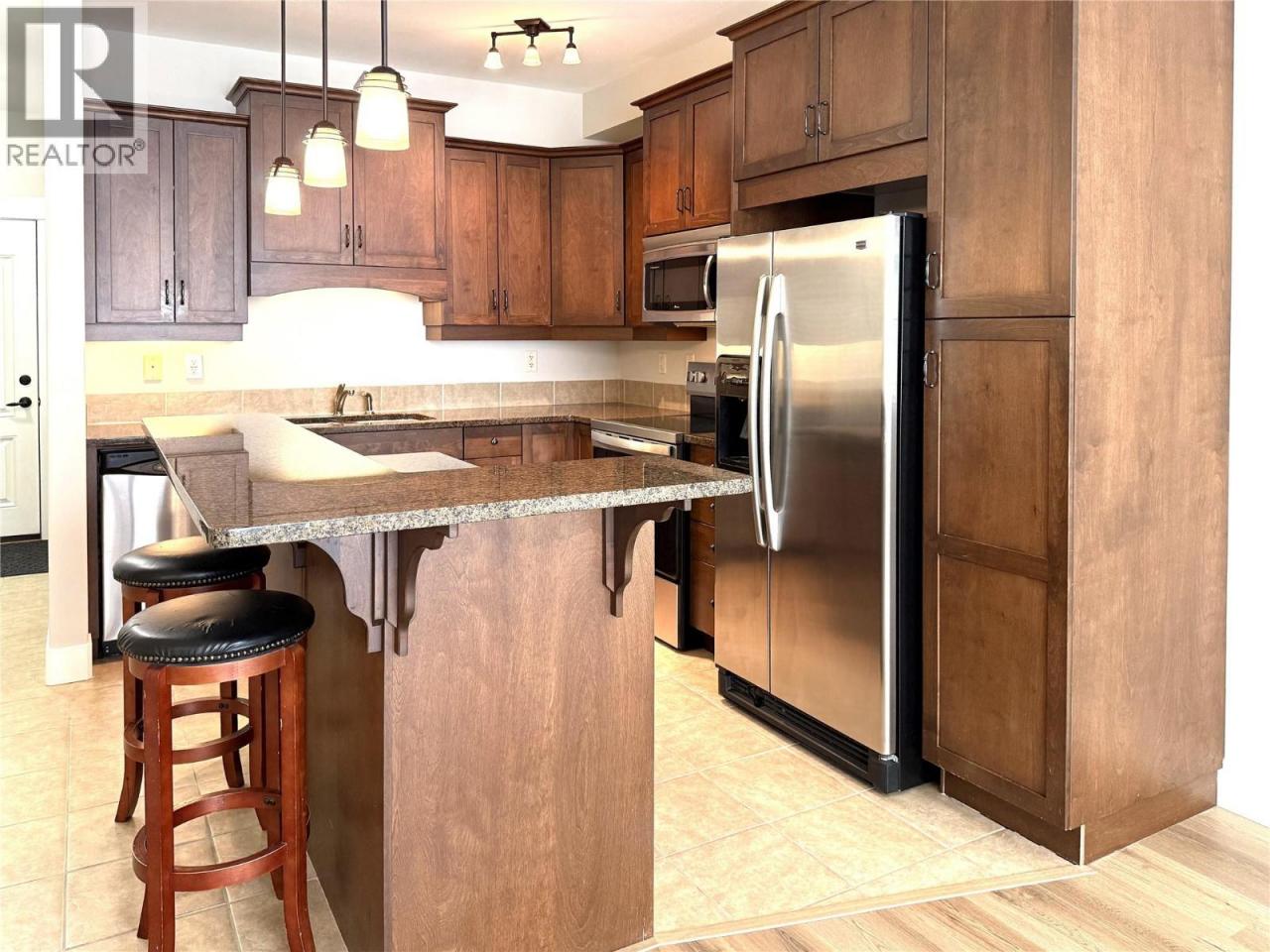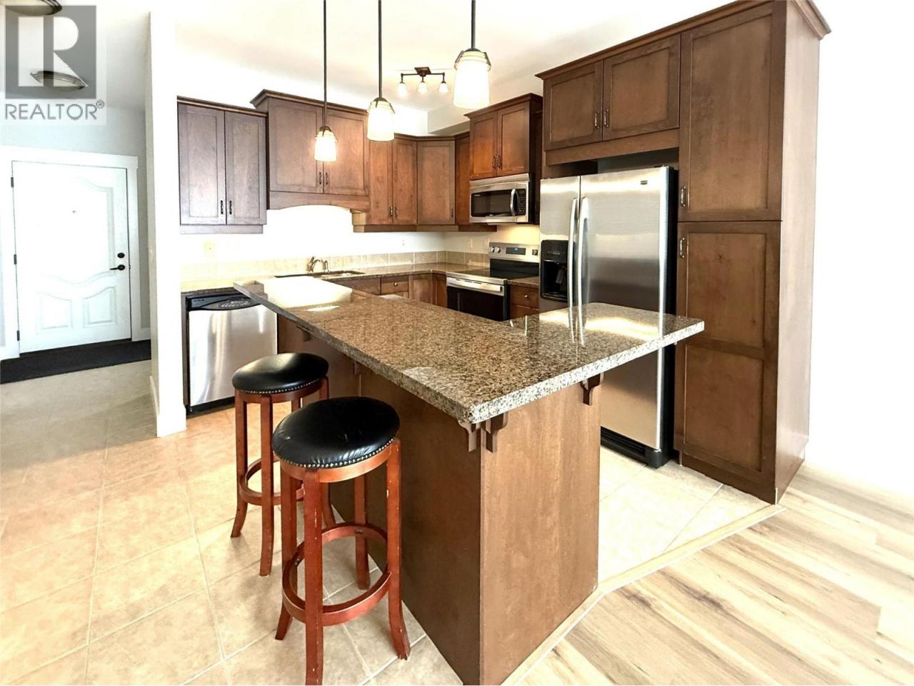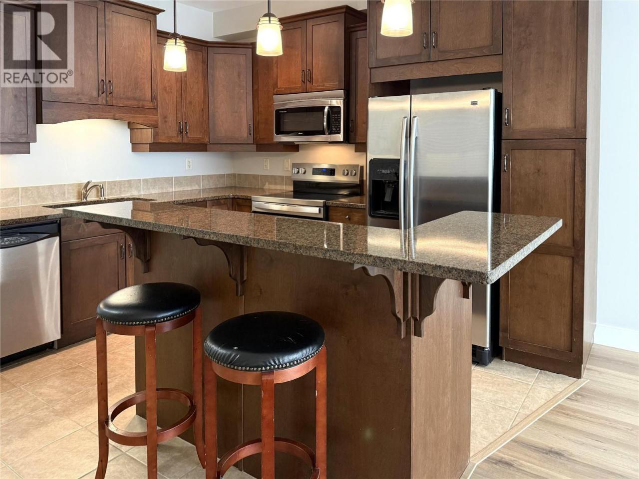 Skip the High Rent - Own Your Own Place Near Campus! Why rent when you can invest in yourself? This totally renovated 1-bedroom + den apartment is move-in ready and just a short walk to the university, shops, and all amenities. Fresh & Modern: New laminate floors, fresh paint, brand-new stove, new blinds, and a classy bathroom with tub + separate shower. Smart Layout: Spacious living room with cozy electric fireplace and wall A/C, opening to a covered deck backing onto peaceful green space - perfect for study breaks. Entertainer’s Kitchen: Granite island with raised bar (bar stools included), stainless steel appliances, and extra pantry storage. Convenience Built In: In-suite laundry, mirrored closets, underground parking (#A1), and private storage room (#2). Bonus Den: Ideal home office or study space. This home gives you comfort, independence, and the freedom to stop throwing money away on rent with quick possession available. Some rooms virtually staged. (id:6769)