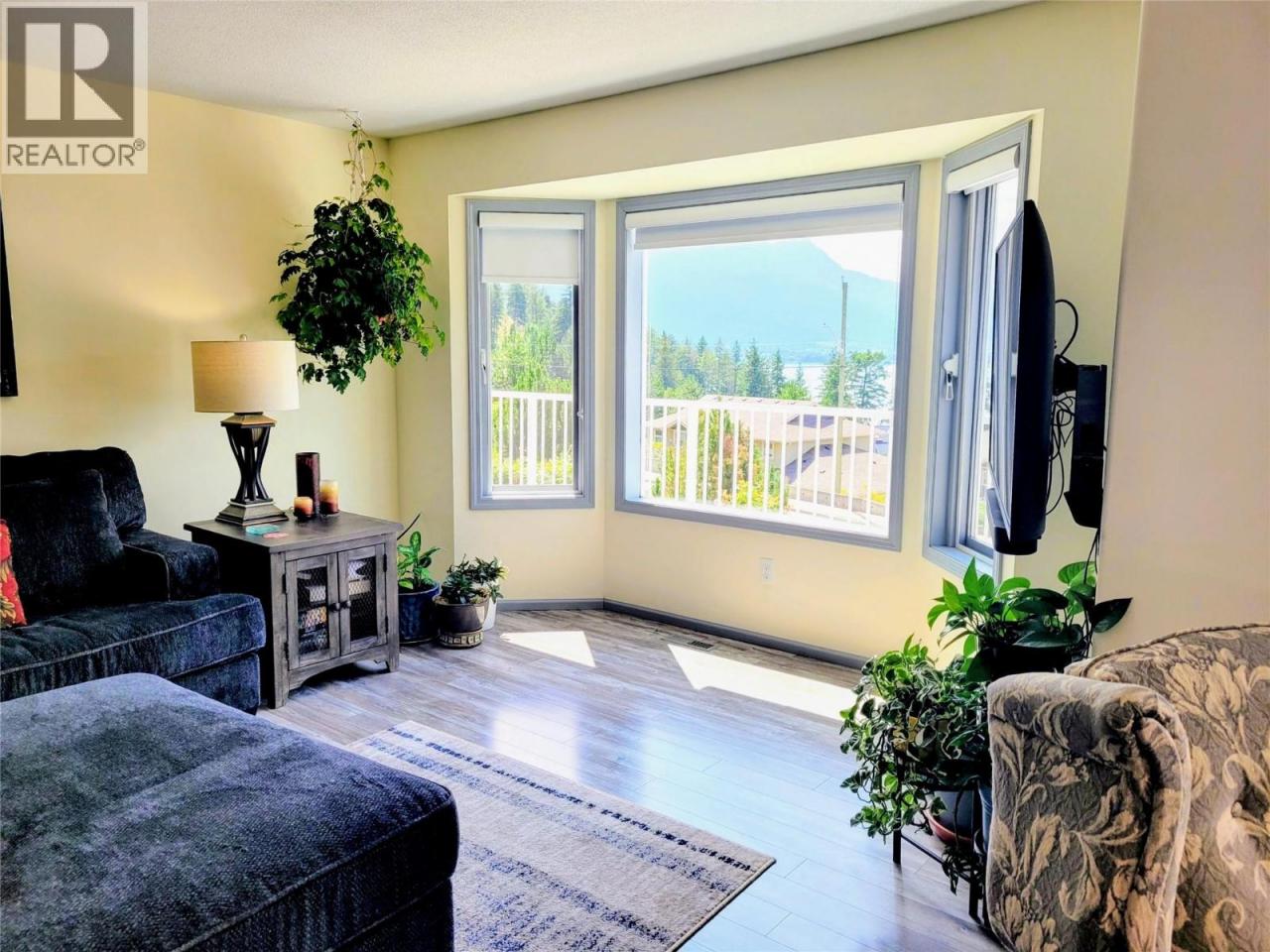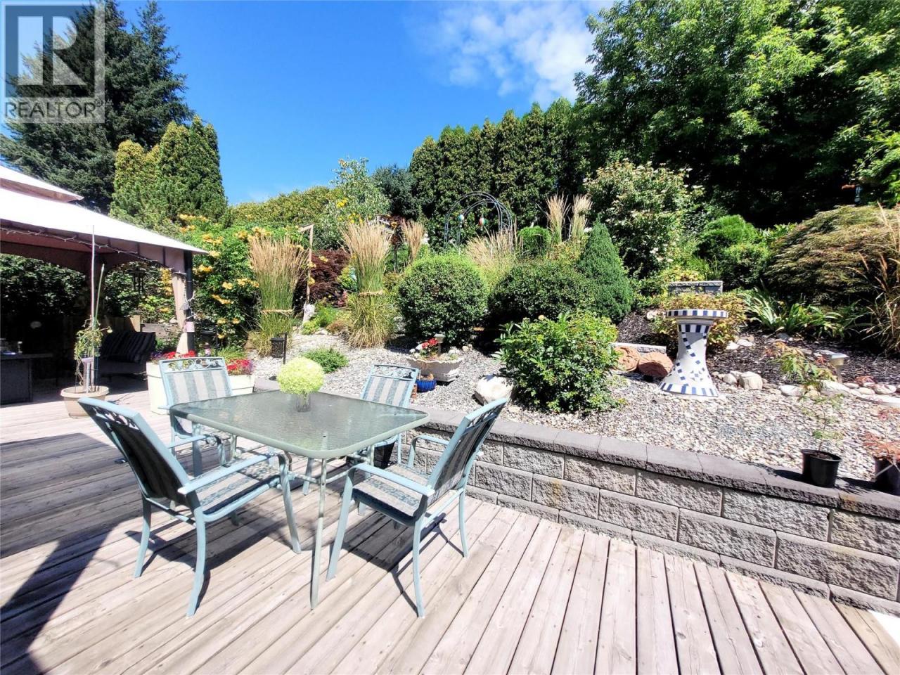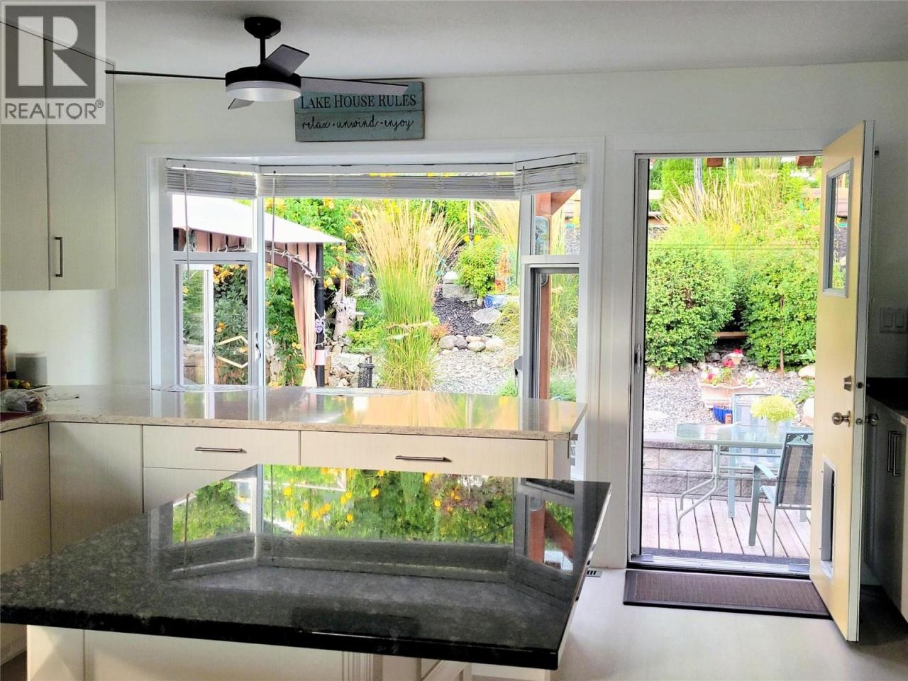 UPDATED 4 bedroom, 3 bath, O/S double garage, separate workshop, HUGE Lakeview. Back yard completely fenced. Room for RV/boat at the end of the house. Built in vac, top deck has motorized awning w/wind sensor. High efficiency gas furnace, central Air. New sealed glass units in every window, up & down. Main floor w/new renovations in the kitchen & dining room, incl: new gas fireplace & new floors. Large granite topped island in kitchen, counters are quartz in all 3 bathroom vanities. From the kitchen there are beautiful views of the lake & mountains out front, or the colorful landscaping in the yard to the back. Laundry room is near kitchen with closets. Primary bedroom also has the huge lake view & a glass shower ensuite & walk in closet. Main bathroom has a 1 pc fiberglass tub/shower. New plywood & vinyl on upper front deck, with new railing. Downstairs has a rec room & office/hobby room, both with lakeview, plus the 4th large bedroom, computer area & another updated bathroom with glass shower. Huge storage room with built in shelves. Garage has 2nd fridge built in. Rec room has patio doors out to the front lower deck. Back upstairs you step out to the back deck with multiple seating areas, bbq area, & a curved boardwalk to upper garden, raised beds & a garden shed plus seating area. Driveway done 2020, roof is 12 and has just had a $2000 treatment with a 5 yr transferable warranty against any recurring moss, hot water tank 2018, high efficiency furnace 2011. (id:6769)