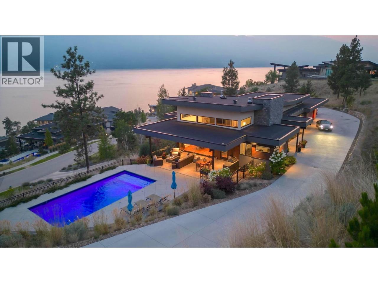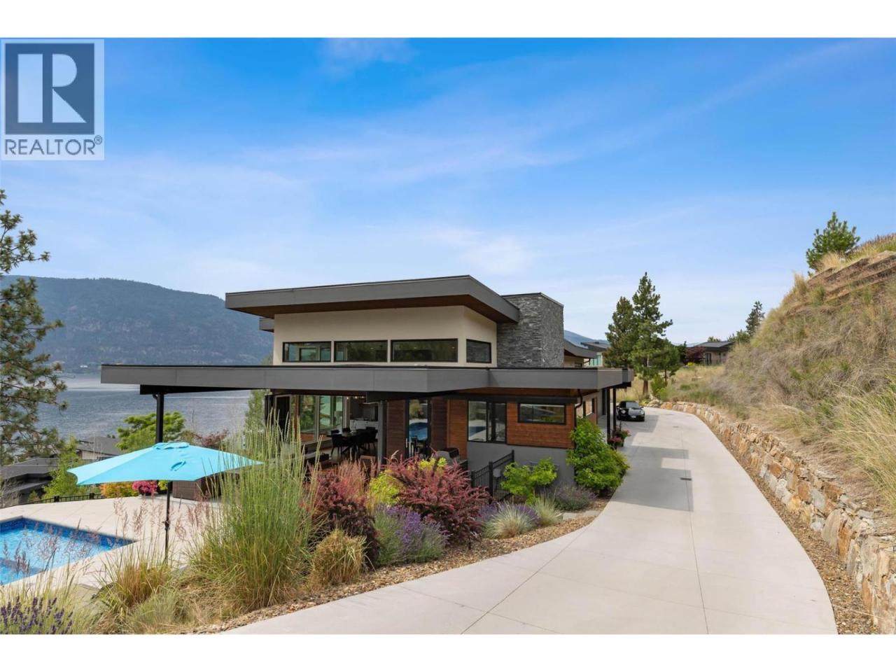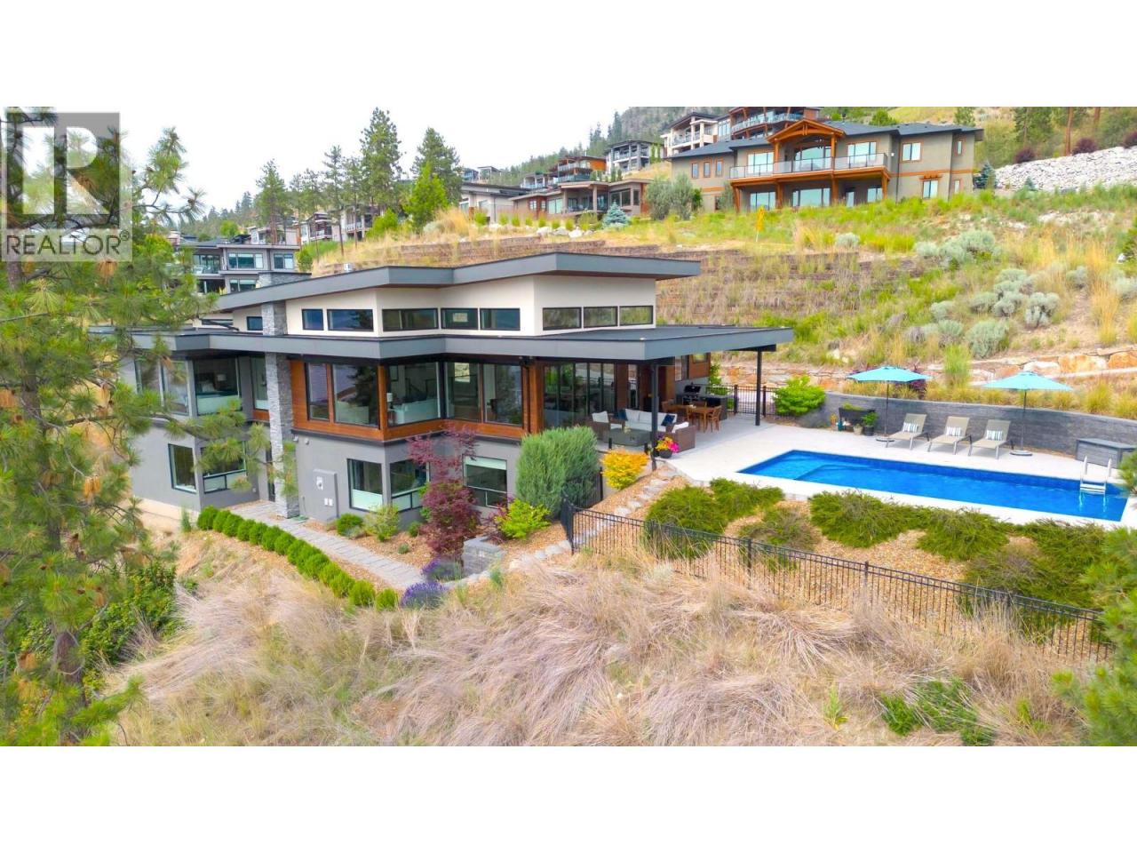 Prestigious Lakestone Estates! This gorgeous 4+ bedroom 5,100+ sq/ft West-Coast contemporary 'lake house' w/ 3+ Car Garage (boat space) with a 0.78 Acre lot sits on one of the Okanagan's most desirable streets. Opening the 15 ft Folding Sliding Door allows the dining room and kitchen to extend onto a covered deck with fire table area, BBQ space, sun lounging zone, salt water pool, and hot tub. Inside, the 14 ft ceilings and full windows create a serene vista from which to take in the panoramic view of the lake. Retreat to a luxury primary bedroom w/ large walk-in closet and spa-inspired Ensuite. Off the contemporary chef's kitchen with 12ft island, is a small office and walk-in pantry housing the extras - ideal for entertaining. Downstairs you will find 3 bedrooms, a chilled wine display, a flex room / second laundry (roughed-in 4th bath), media room, and large Rec Room / Multi-purpose space with two access doors and direct stairs to garage for convenience. Incredibly well thought out, and meticulously maintained. High end hardwood floors, quartz counters, and custom cabinetry throughout. Multi-zoned heating/cooling and multi-room speakers. An easy stroll to Lakestone’s beach for boating access, kayaking or SUP boarding, tennis and pickle ball courts, and hiking / biking trails. Enjoy sampling wine at one of 7 local wineries. This location and home will not disappoint! View HD Video w aerial drone footage (See Media Link), Virtual Tour, & Floor plans. Low strata - Not in HOA. (id:6769)