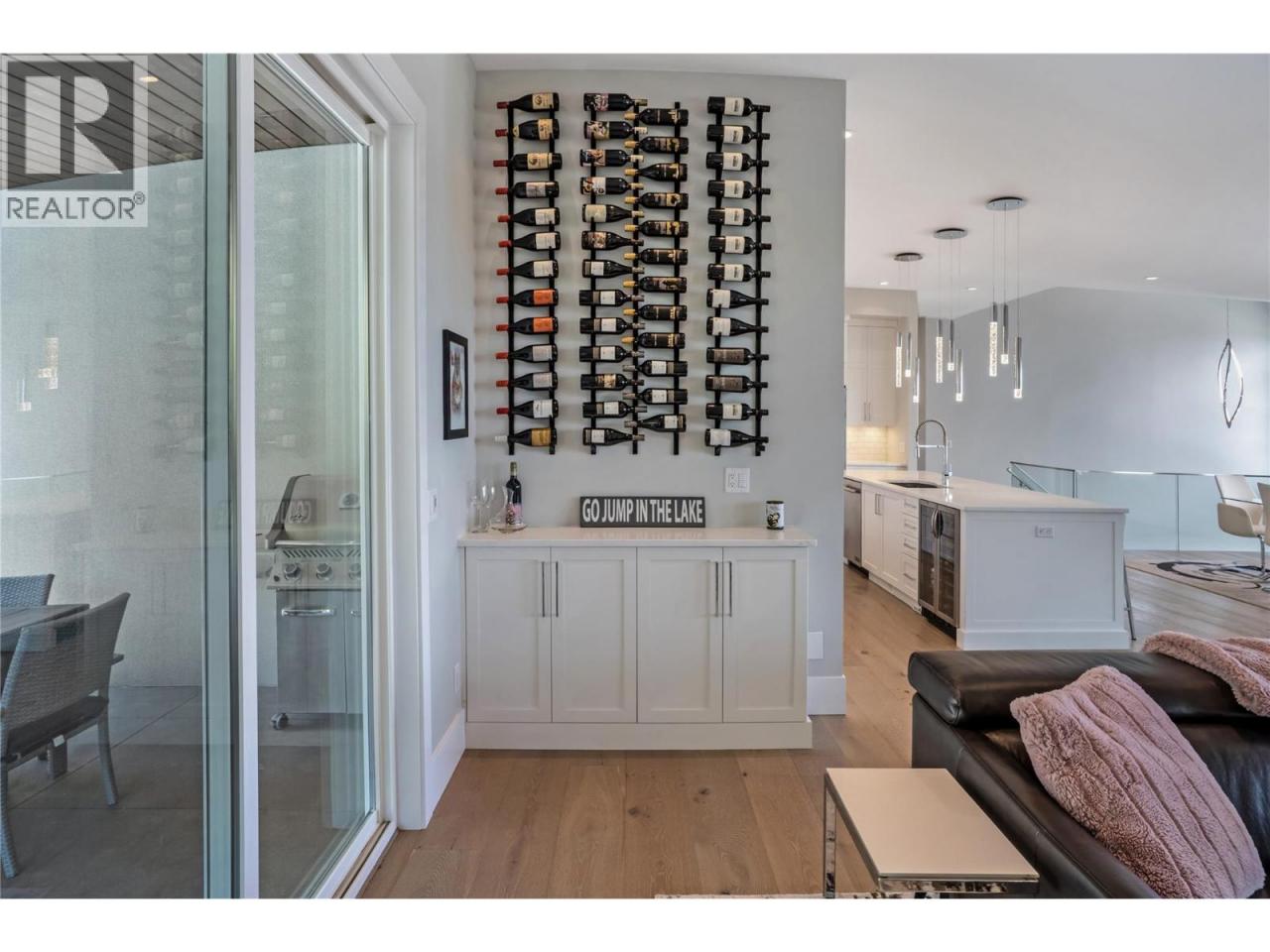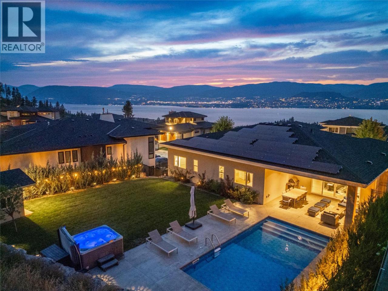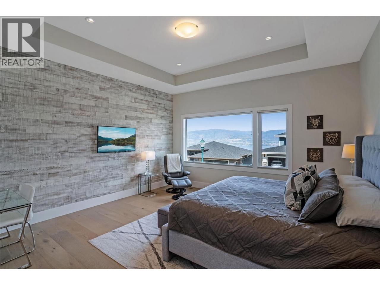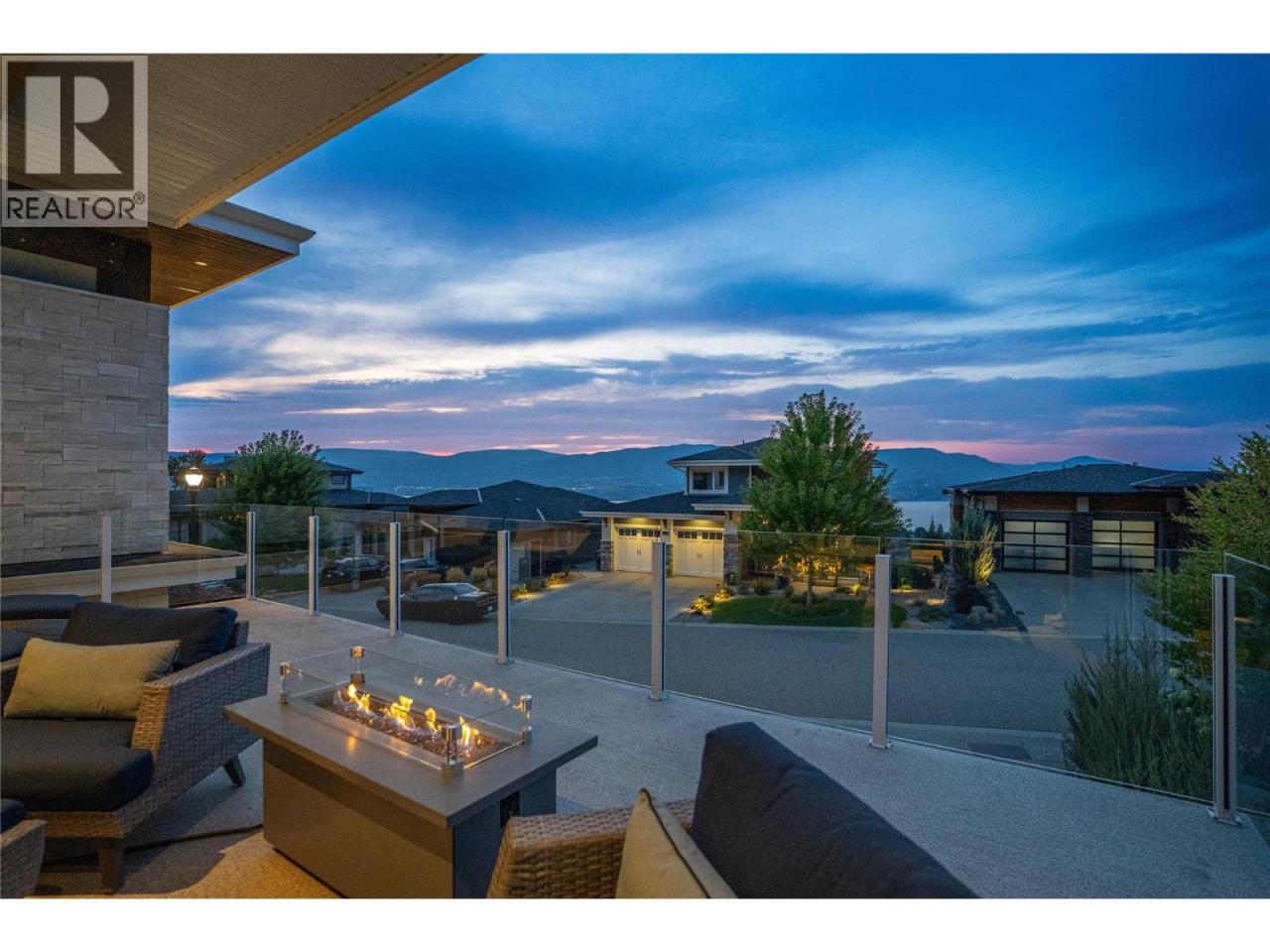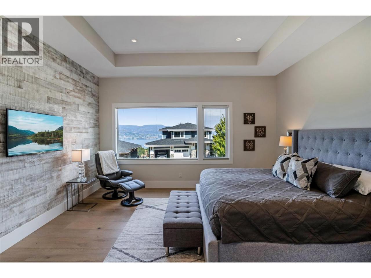 Discover custom-built luxury in this stunning 5-bedroom, 5-bath home featuring a bright, legal 1-bedroom ground-level suite. This high-efficiency smart home boasts soaring vaulted ceilings, a dramatic floating staircase, and rich wide plank wood floors. The open-concept main floor centers around a chef’s kitchen with quartz countertops, custom cabinetry, and a hidden walk-in butler’s pantry. Flow effortlessly into the spacious dining and living areas warmed by a gas fireplace, then step out onto the front deck to enjoy Okanagan Lake and mountain views. The private backyard is an entertainer’s dream with a heated saltwater pool, hot tub, and ample space to relax or host gatherings. The main-level master suite offers a spa-like retreat with a soaker tub, glass-enclosed shower, and double floating vanity with undermount lighting. Two additional bedrooms share a stylish Jack & Jill bath, with one bedroom featuring a queen Murphy bed—ideal for guests or a home office. A large laundry room with abundant counters and cabinetry enhances daily functionality. The lower level features a generous rec room with an electric fireplace, wet bar, guest bedroom, and full bath. The oversized three-car garage easily fits a boat, a car, and plenty of toys. Exceptional millwork, designer fixtures, and quality finishes elevate every room. Enjoy close proximity to top schools, parks, dining, and Okanagan’s renowned wineries. Luxury, comfort, and thoughtful design converge in this remarkable home. (id:6769)