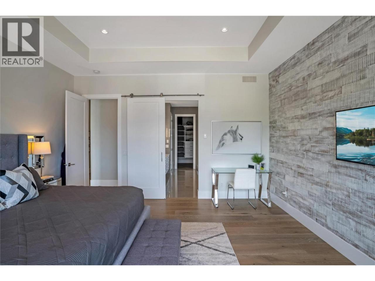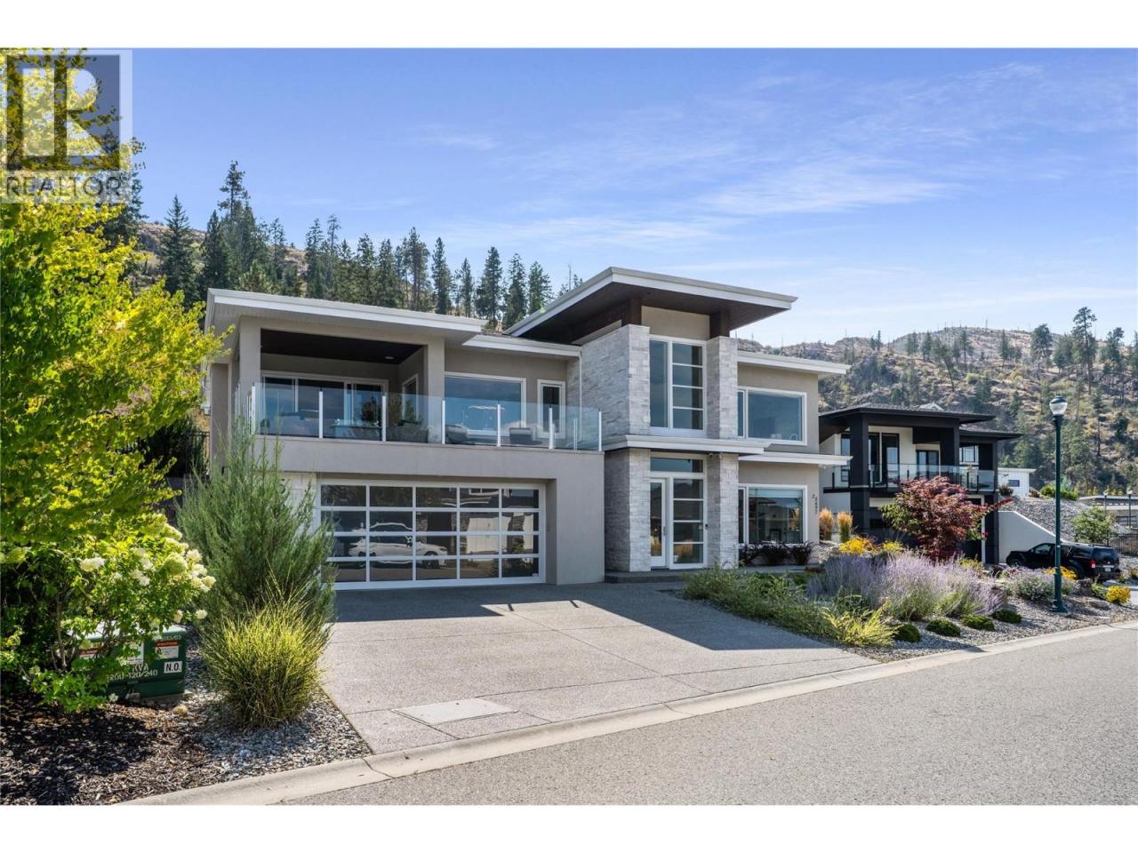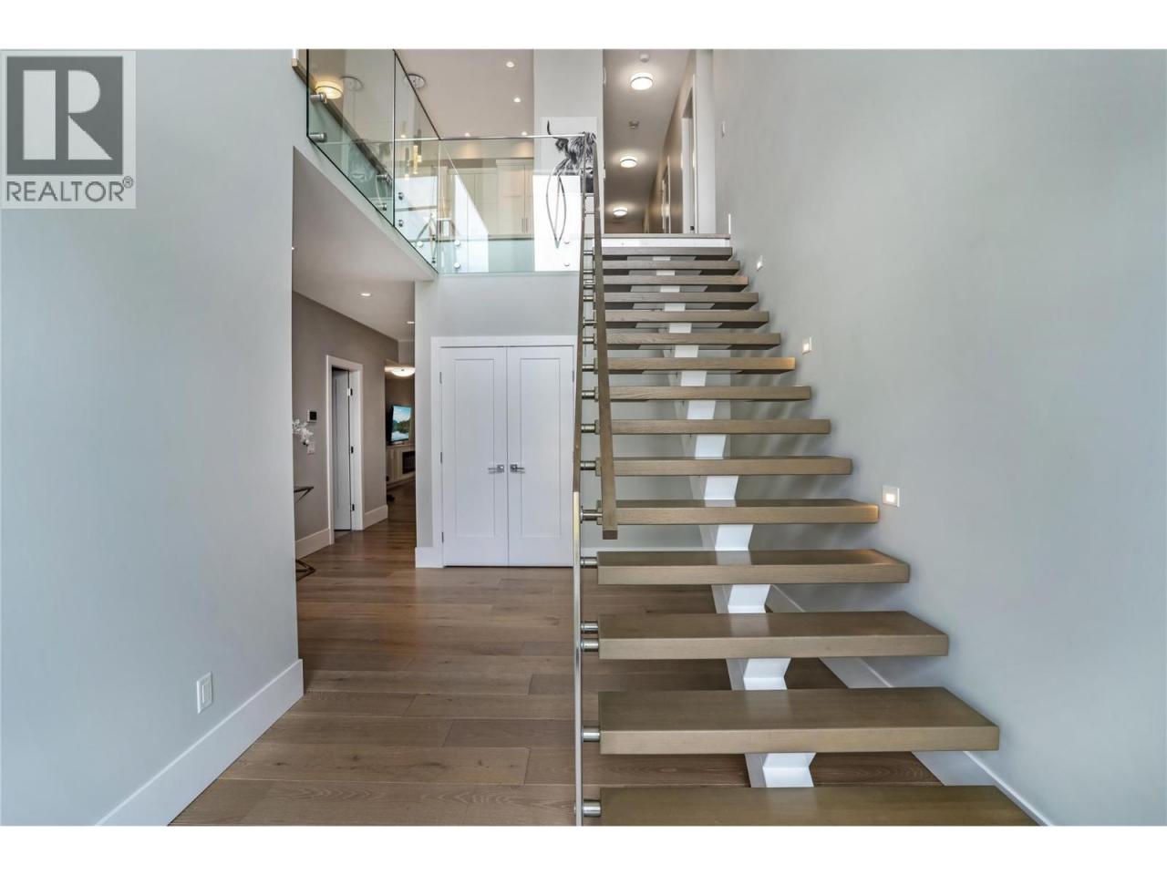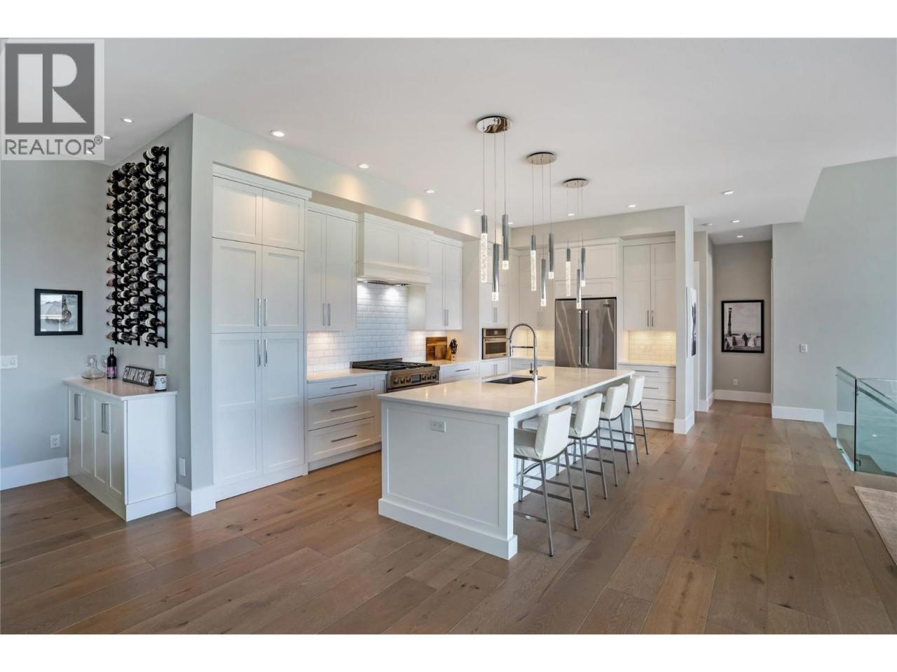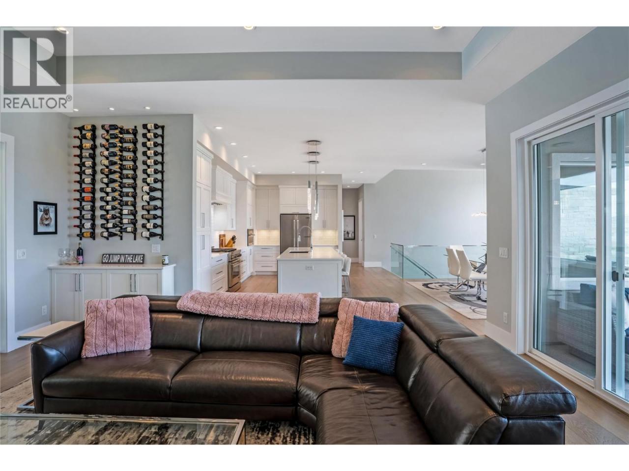 Discover custom-built luxury in this stunning 5-bedroom, 5-bath home featuring a bright, legal 1-bedroom ground-level suite. This high-efficiency smart home boasts soaring vaulted ceilings, a dramatic floating staircase, and rich wide plank wood floors. The open-concept main floor centers around a chef’s kitchen with quartz countertops, custom cabinetry, and a hidden walk-in butler’s pantry. Flow effortlessly into the spacious dining and living areas warmed by a gas fireplace, then step out onto the front deck to enjoy Okanagan Lake and mountain views. The private backyard is an entertainer’s dream with a heated saltwater pool, hot tub, and ample space to relax or host gatherings. The main-level master suite offers a spa-like retreat with a soaker tub, glass-enclosed shower, and double floating vanity with undermount lighting. Two additional bedrooms share a stylish Jack & Jill bath, with one bedroom featuring a queen Murphy bed—ideal for guests or a home office. A large laundry room with abundant counters and cabinetry enhances daily functionality. The lower level features a generous rec room with an electric fireplace, wet bar, guest bedroom, and full bath. The oversized three-car garage easily fits a boat, a car, and plenty of toys. Exceptional millwork, designer fixtures, and quality finishes elevate every room. Enjoy close proximity to top schools, parks, dining, and Okanagan’s renowned wineries. Luxury, comfort, and thoughtful design converge in this remarkable home. (id:6769)