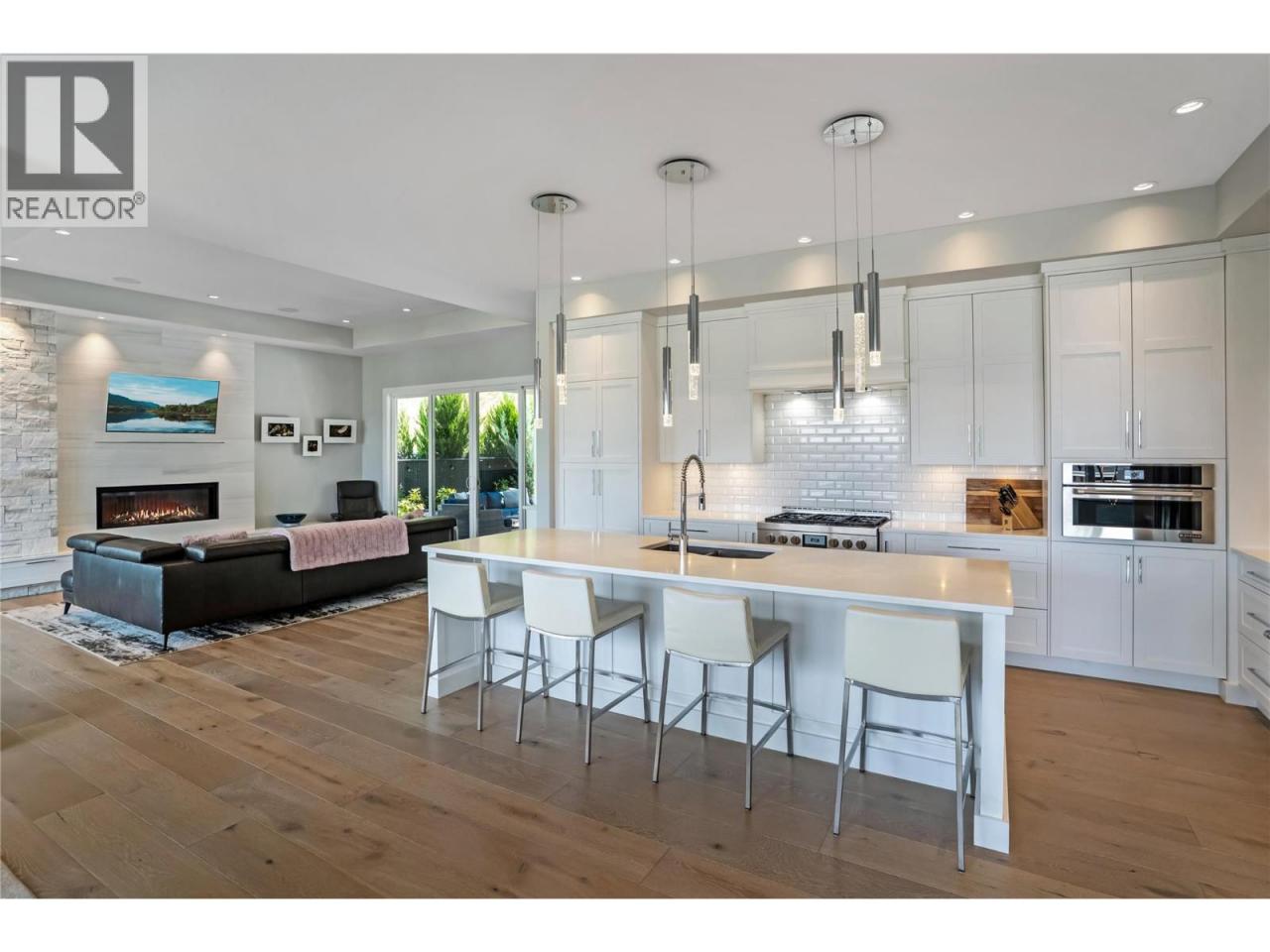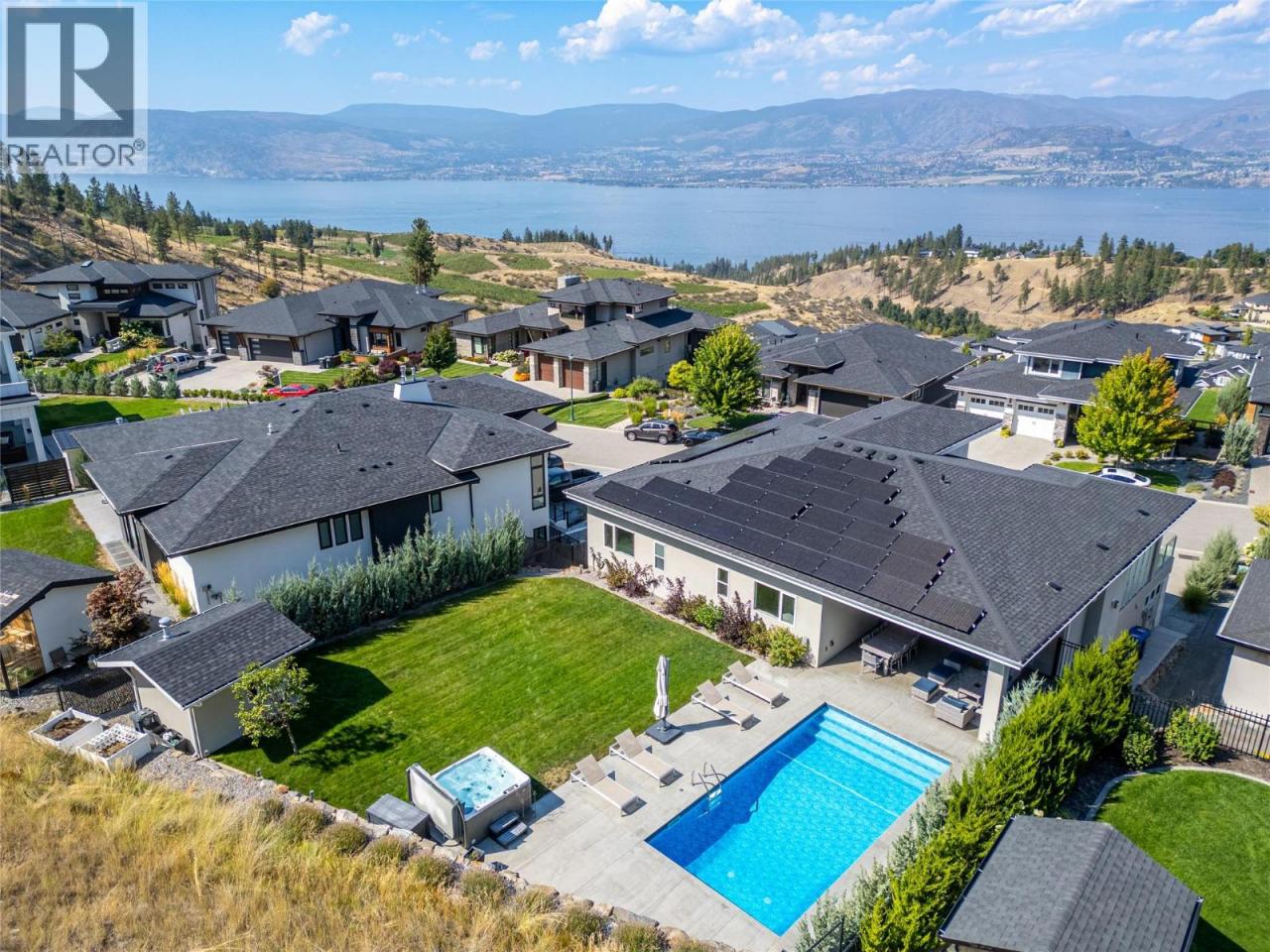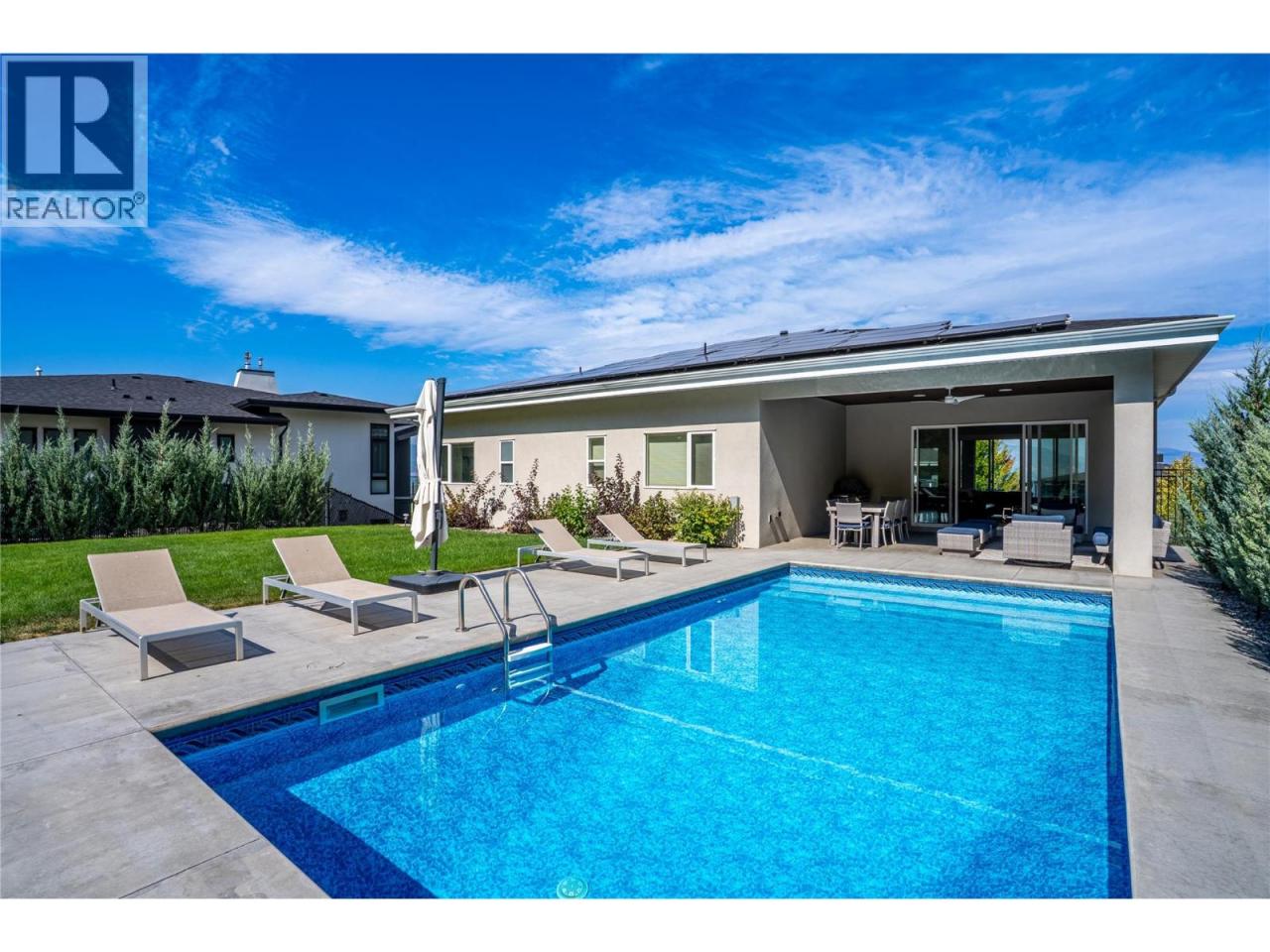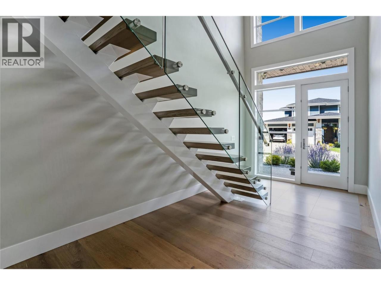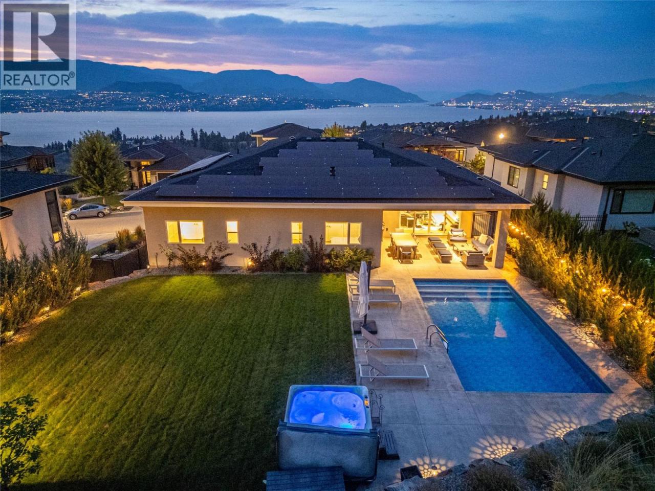 Discover custom-built luxury in this stunning 5-bedroom, 5-bath home featuring a bright, legal 1-bedroom ground-level suite. This high-efficiency smart home boasts soaring vaulted ceilings, a dramatic floating staircase, and rich wide plank wood floors. The open-concept main floor centers around a chef’s kitchen with quartz countertops, custom cabinetry, and a hidden walk-in butler’s pantry. Flow effortlessly into the spacious dining and living areas warmed by a gas fireplace, then step out onto the front deck to enjoy Okanagan Lake and mountain views. The private backyard is an entertainer’s dream with a heated saltwater pool, hot tub, and ample space to relax or host gatherings. The main-level master suite offers a spa-like retreat with a soaker tub, glass-enclosed shower, and double floating vanity with undermount lighting. Two additional bedrooms share a stylish Jack & Jill bath, with one bedroom featuring a queen Murphy bed—ideal for guests or a home office. A large laundry room with abundant counters and cabinetry enhances daily functionality. The lower level features a generous rec room with an electric fireplace, wet bar, guest bedroom, and full bath. The oversized three-car garage easily fits a boat, a car, and plenty of toys. Exceptional millwork, designer fixtures, and quality finishes elevate every room. Enjoy close proximity to top schools, parks, dining, and Okanagan’s renowned wineries. Luxury, comfort, and thoughtful design converge in this remarkable home. (id:6769)