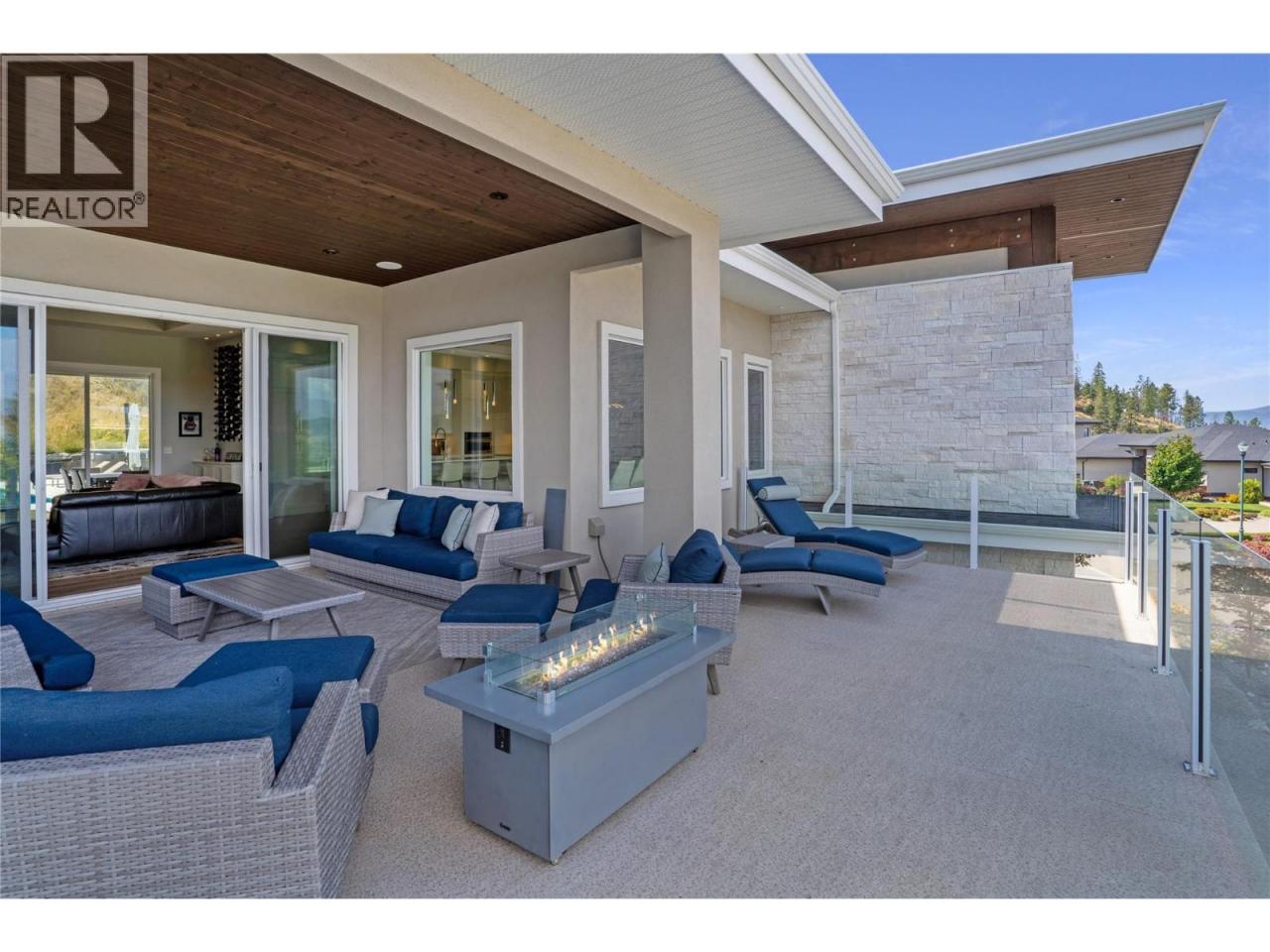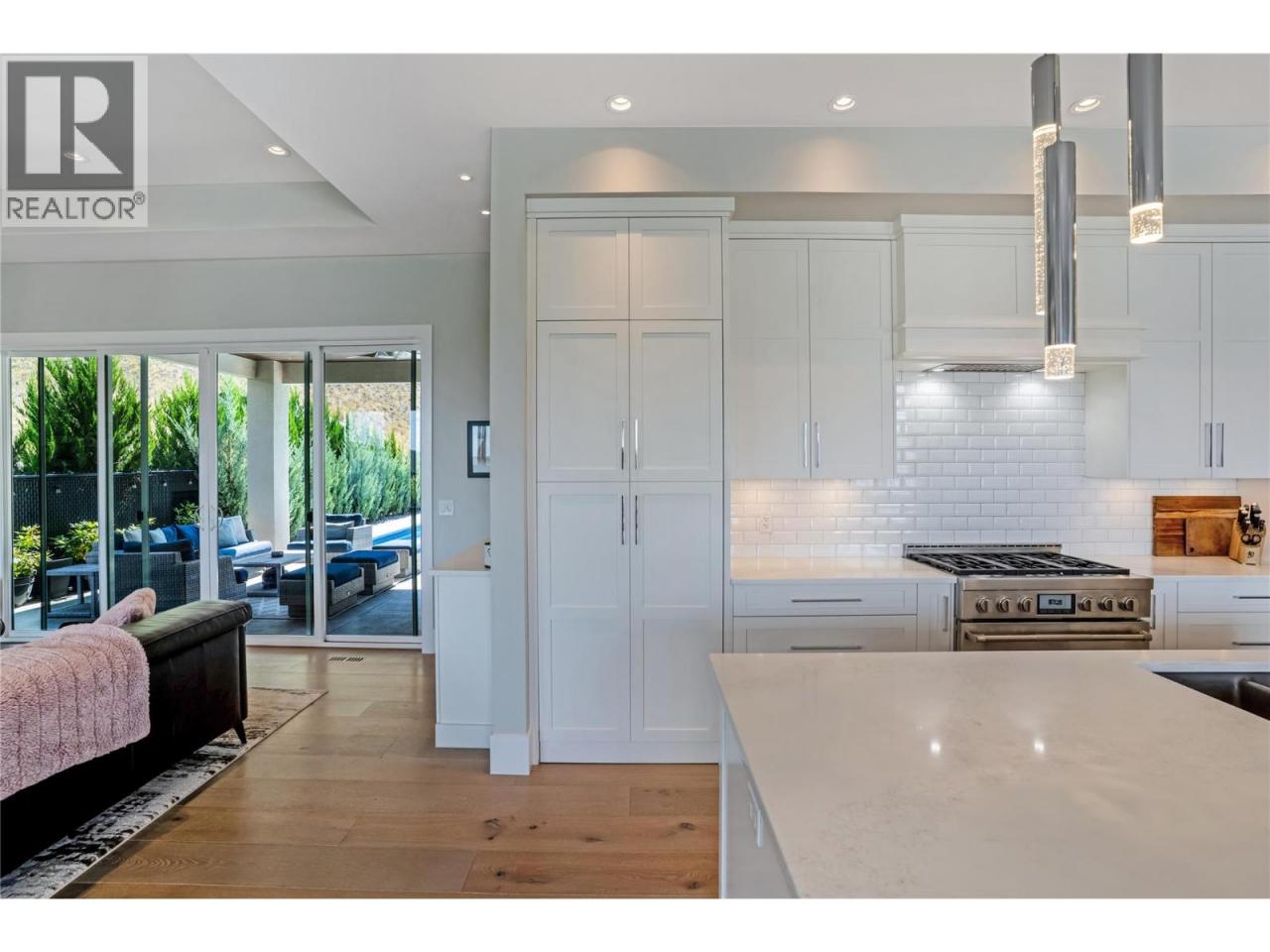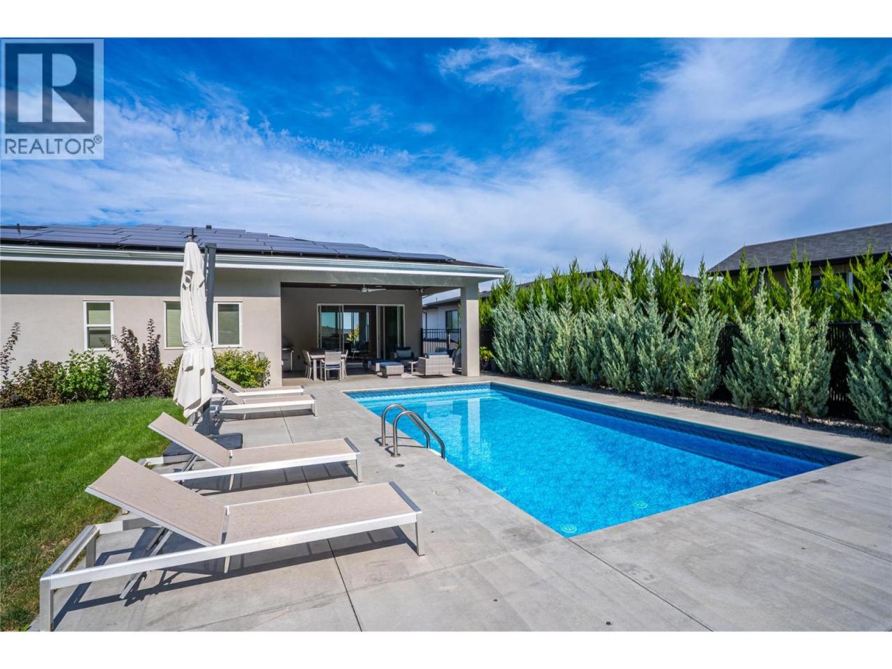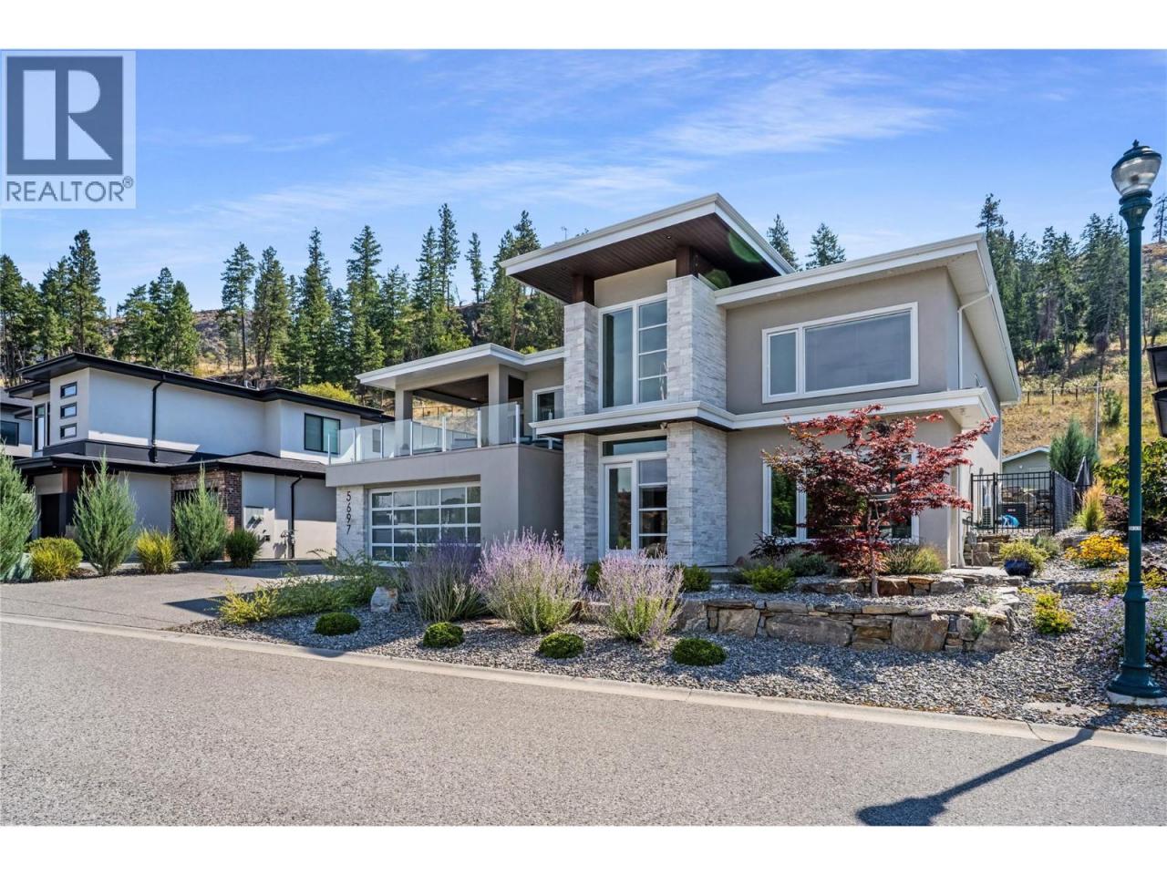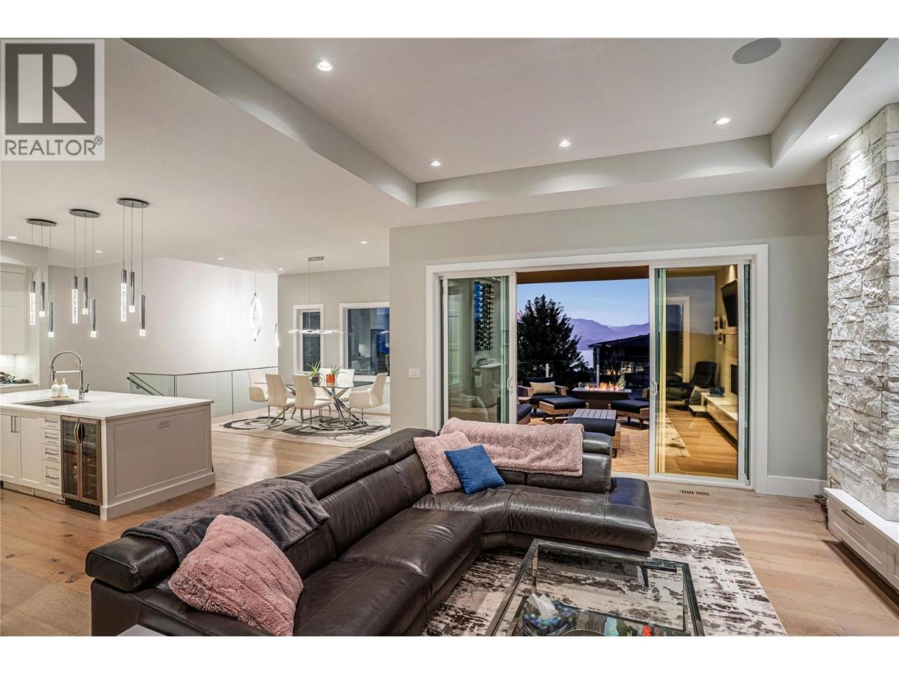 Discover custom-built luxury in this stunning 5-bedroom, 5-bath home featuring a bright, legal 1-bedroom ground-level suite. This high-efficiency smart home boasts soaring vaulted ceilings, a dramatic floating staircase, and rich wide plank wood floors. The open-concept main floor centers around a chef’s kitchen with quartz countertops, custom cabinetry, and a hidden walk-in butler’s pantry. Flow effortlessly into the spacious dining and living areas warmed by a gas fireplace, then step out onto the front deck to enjoy Okanagan Lake and mountain views. The private backyard is an entertainer’s dream with a heated saltwater pool, hot tub, and ample space to relax or host gatherings. The main-level master suite offers a spa-like retreat with a soaker tub, glass-enclosed shower, and double floating vanity with undermount lighting. Two additional bedrooms share a stylish Jack & Jill bath, with one bedroom featuring a queen Murphy bed—ideal for guests or a home office. A large laundry room with abundant counters and cabinetry enhances daily functionality. The lower level features a generous rec room with an electric fireplace, wet bar, guest bedroom, and full bath. The oversized three-car garage easily fits a boat, a car, and plenty of toys. Exceptional millwork, designer fixtures, and quality finishes elevate every room. Enjoy close proximity to top schools, parks, dining, and Okanagan’s renowned wineries. Luxury, comfort, and thoughtful design converge in this remarkable home. (id:6769)