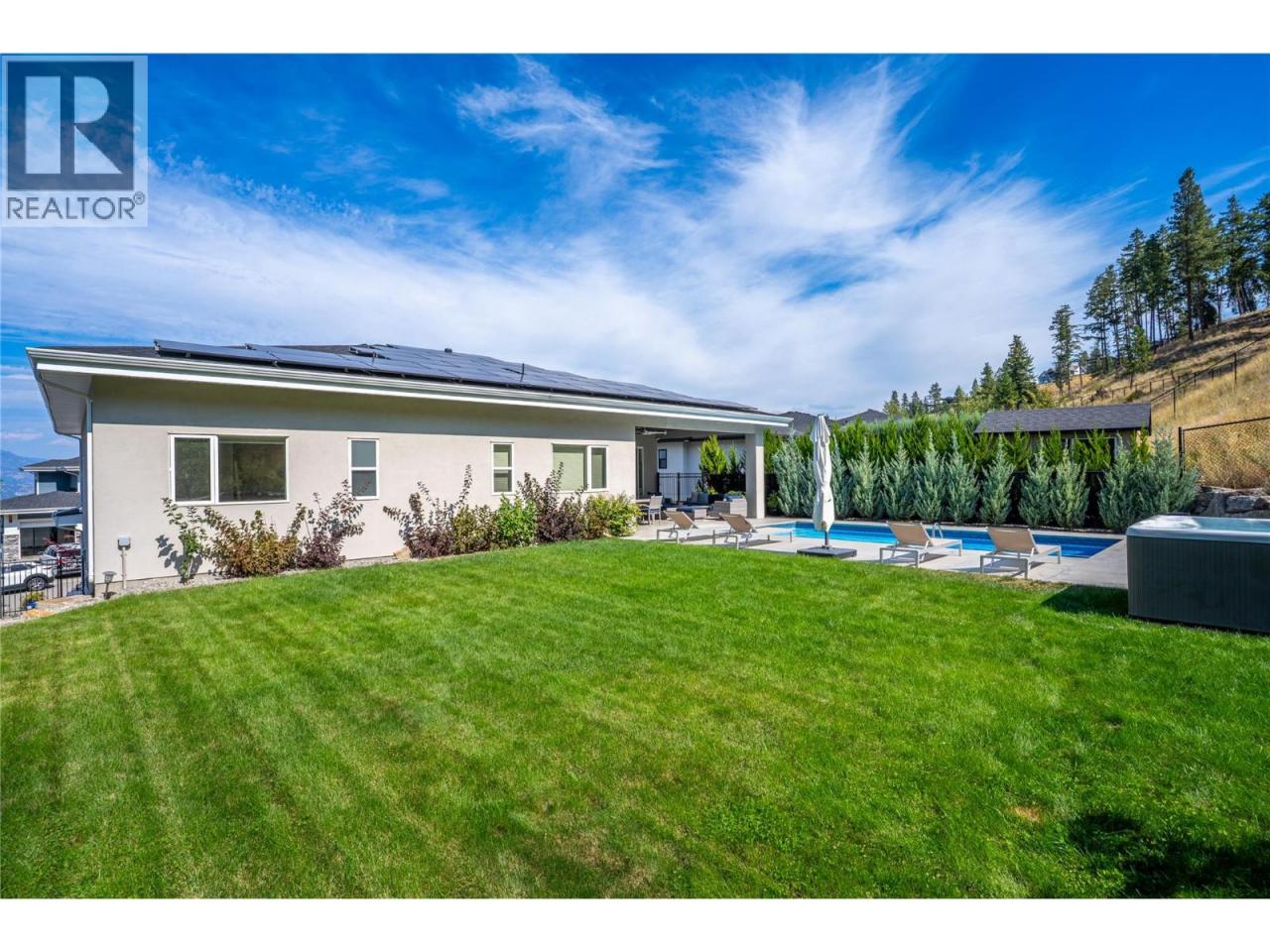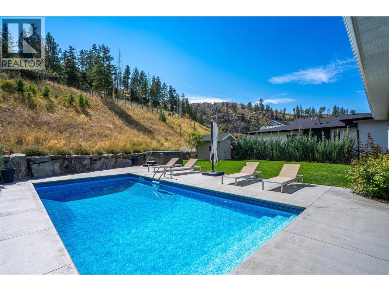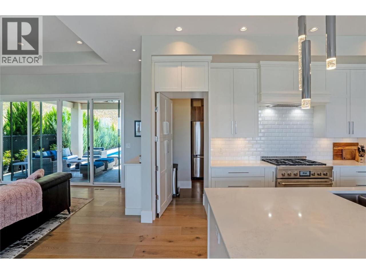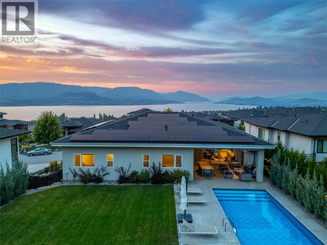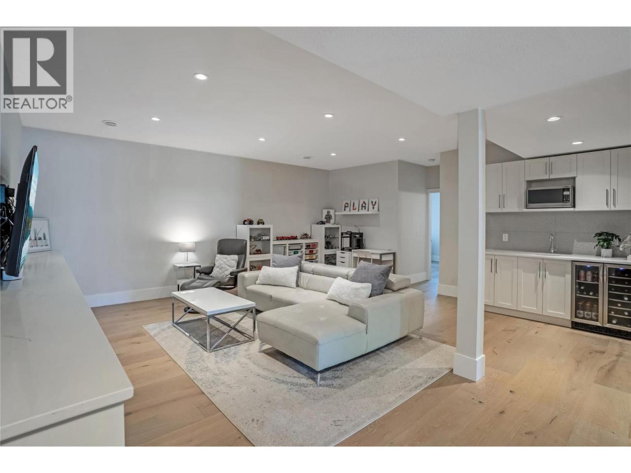 Discover custom-built luxury in this stunning 5-bedroom, 5-bath home featuring a bright, legal 1-bedroom ground-level suite. This high-efficiency smart home boasts soaring vaulted ceilings, a dramatic floating staircase, and rich wide plank wood floors. The open-concept main floor centers around a chef’s kitchen with quartz countertops, custom cabinetry, and a hidden walk-in butler’s pantry. Flow effortlessly into the spacious dining and living areas warmed by a gas fireplace, then step out onto the front deck to enjoy Okanagan Lake and mountain views. The private backyard is an entertainer’s dream with a heated saltwater pool, hot tub, and ample space to relax or host gatherings. The main-level master suite offers a spa-like retreat with a soaker tub, glass-enclosed shower, and double floating vanity with undermount lighting. Two additional bedrooms share a stylish Jack & Jill bath, with one bedroom featuring a queen Murphy bed—ideal for guests or a home office. A large laundry room with abundant counters and cabinetry enhances daily functionality. The lower level features a generous rec room with an electric fireplace, wet bar, guest bedroom, and full bath. The oversized three-car garage easily fits a boat, a car, and plenty of toys. Exceptional millwork, designer fixtures, and quality finishes elevate every room. Enjoy close proximity to top schools, parks, dining, and Okanagan’s renowned wineries. Luxury, comfort, and thoughtful design converge in this remarkable home. (id:6769)