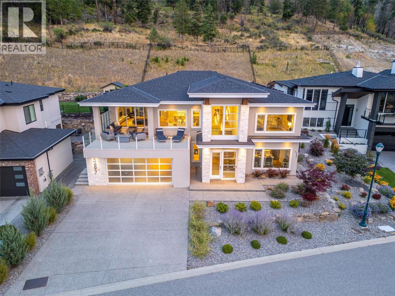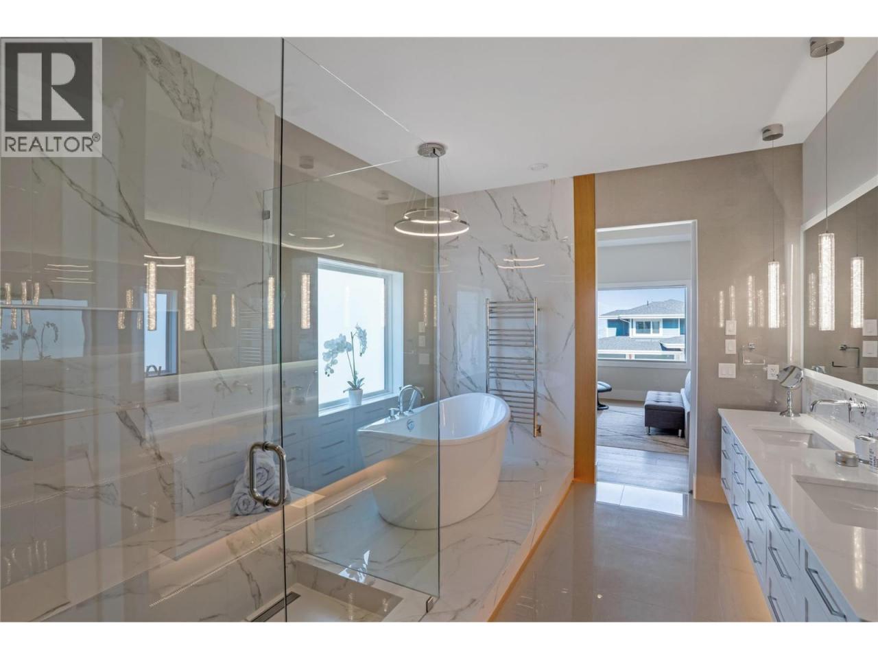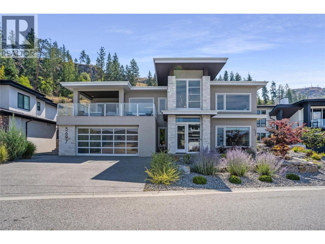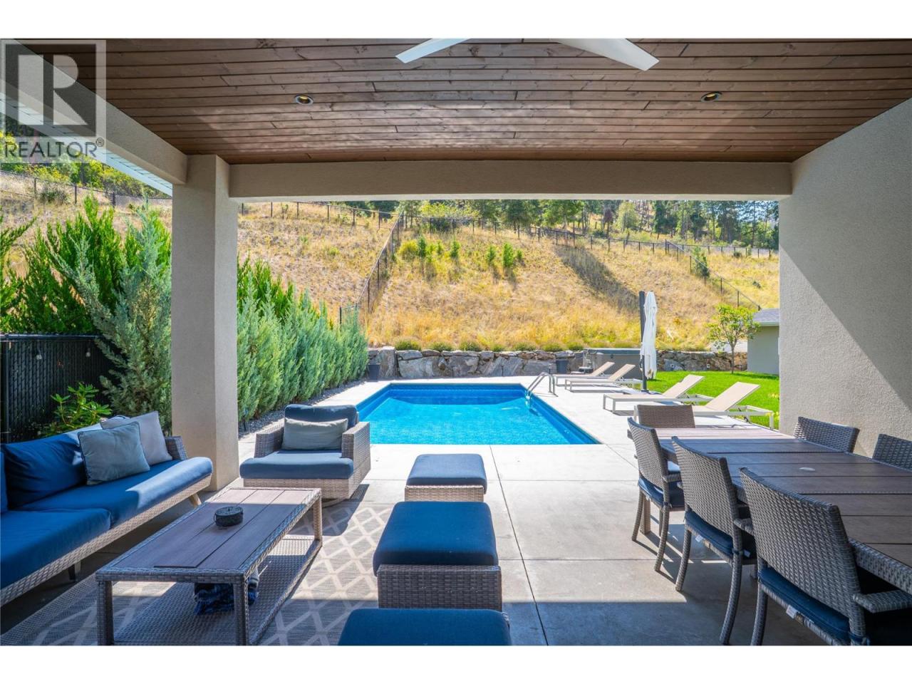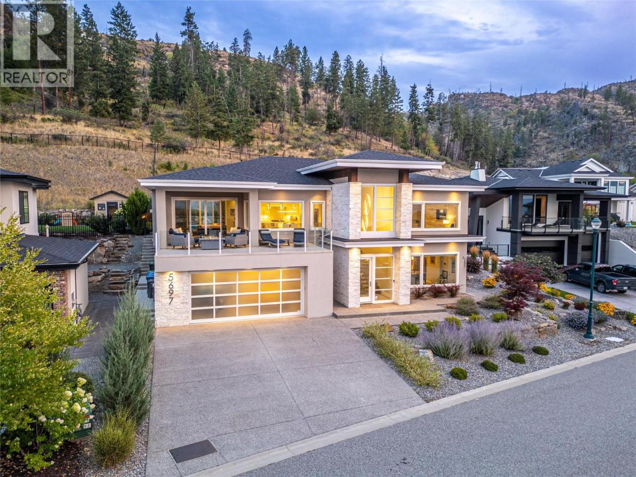 Discover custom-built luxury in this stunning 5-bedroom, 5-bath home featuring a bright, legal 1-bedroom ground-level suite. This high-efficiency smart home boasts soaring vaulted ceilings, a dramatic floating staircase, and rich wide plank wood floors. The open-concept main floor centers around a chef’s kitchen with quartz countertops, custom cabinetry, and a hidden walk-in butler’s pantry. Flow effortlessly into the spacious dining and living areas warmed by a gas fireplace, then step out onto the front deck to enjoy Okanagan Lake and mountain views. The private backyard is an entertainer’s dream with a heated saltwater pool, hot tub, and ample space to relax or host gatherings. The main-level master suite offers a spa-like retreat with a soaker tub, glass-enclosed shower, and double floating vanity with undermount lighting. Two additional bedrooms share a stylish Jack & Jill bath, with one bedroom featuring a queen Murphy bed—ideal for guests or a home office. A large laundry room with abundant counters and cabinetry enhances daily functionality. The lower level features a generous rec room with an electric fireplace, wet bar, guest bedroom, and full bath. The oversized three-car garage easily fits a boat, a car, and plenty of toys. Exceptional millwork, designer fixtures, and quality finishes elevate every room. Enjoy close proximity to top schools, parks, dining, and Okanagan’s renowned wineries. Luxury, comfort, and thoughtful design converge in this remarkable home. (id:6769)