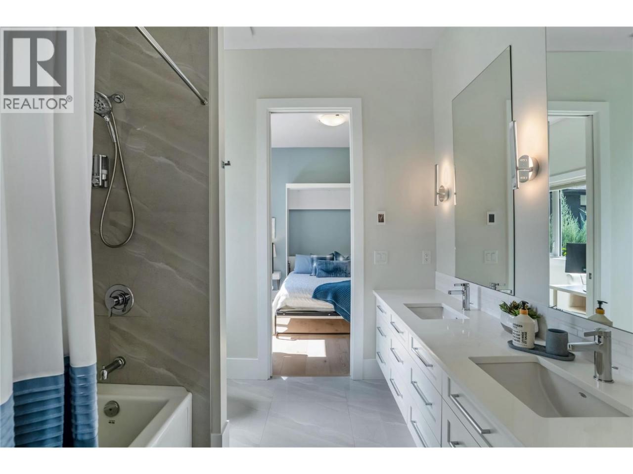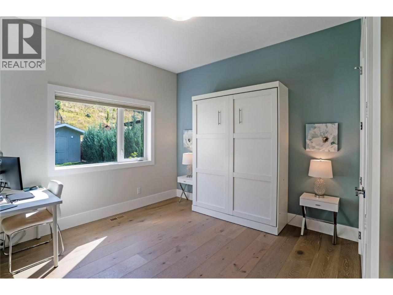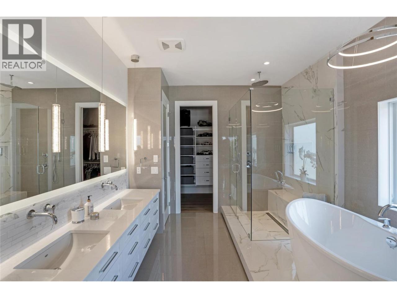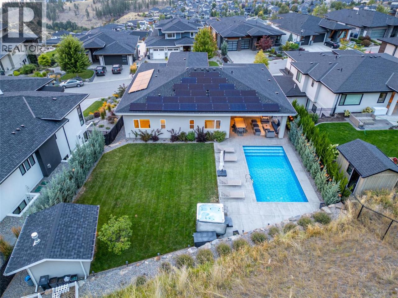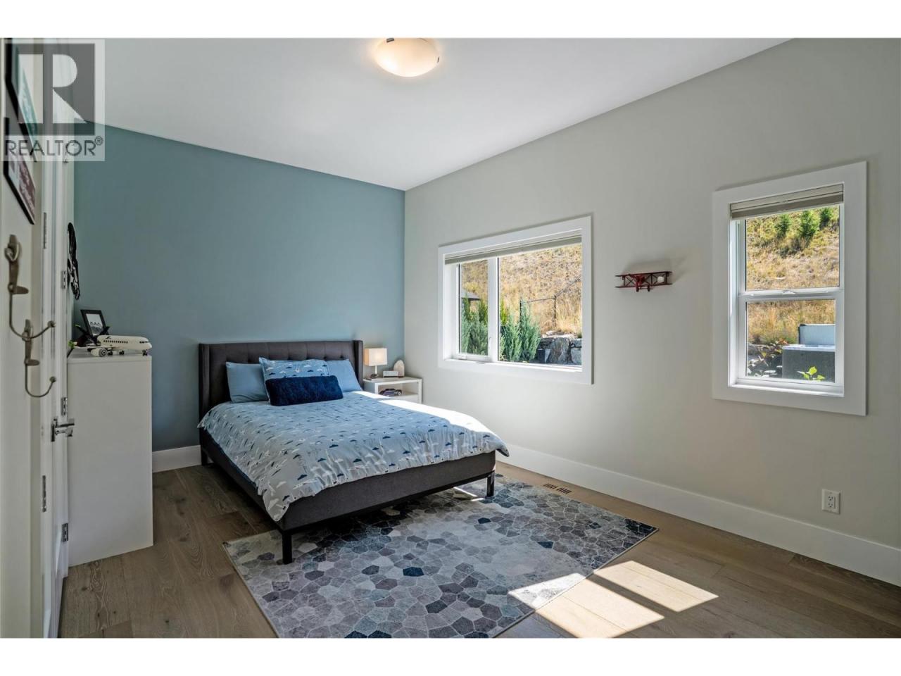 Discover custom-built luxury in this stunning 5-bedroom, 5-bath home featuring a bright, legal 1-bedroom ground-level suite. This high-efficiency smart home boasts soaring vaulted ceilings, a dramatic floating staircase, and rich wide plank wood floors. The open-concept main floor centers around a chef’s kitchen with quartz countertops, custom cabinetry, and a hidden walk-in butler’s pantry. Flow effortlessly into the spacious dining and living areas warmed by a gas fireplace, then step out onto the front deck to enjoy Okanagan Lake and mountain views. The private backyard is an entertainer’s dream with a heated saltwater pool, hot tub, and ample space to relax or host gatherings. The main-level master suite offers a spa-like retreat with a soaker tub, glass-enclosed shower, and double floating vanity with undermount lighting. Two additional bedrooms share a stylish Jack & Jill bath, with one bedroom featuring a queen Murphy bed—ideal for guests or a home office. A large laundry room with abundant counters and cabinetry enhances daily functionality. The lower level features a generous rec room with an electric fireplace, wet bar, guest bedroom, and full bath. The oversized three-car garage easily fits a boat, a car, and plenty of toys. Exceptional millwork, designer fixtures, and quality finishes elevate every room. Enjoy close proximity to top schools, parks, dining, and Okanagan’s renowned wineries. Luxury, comfort, and thoughtful design converge in this remarkable home. (id:6769)