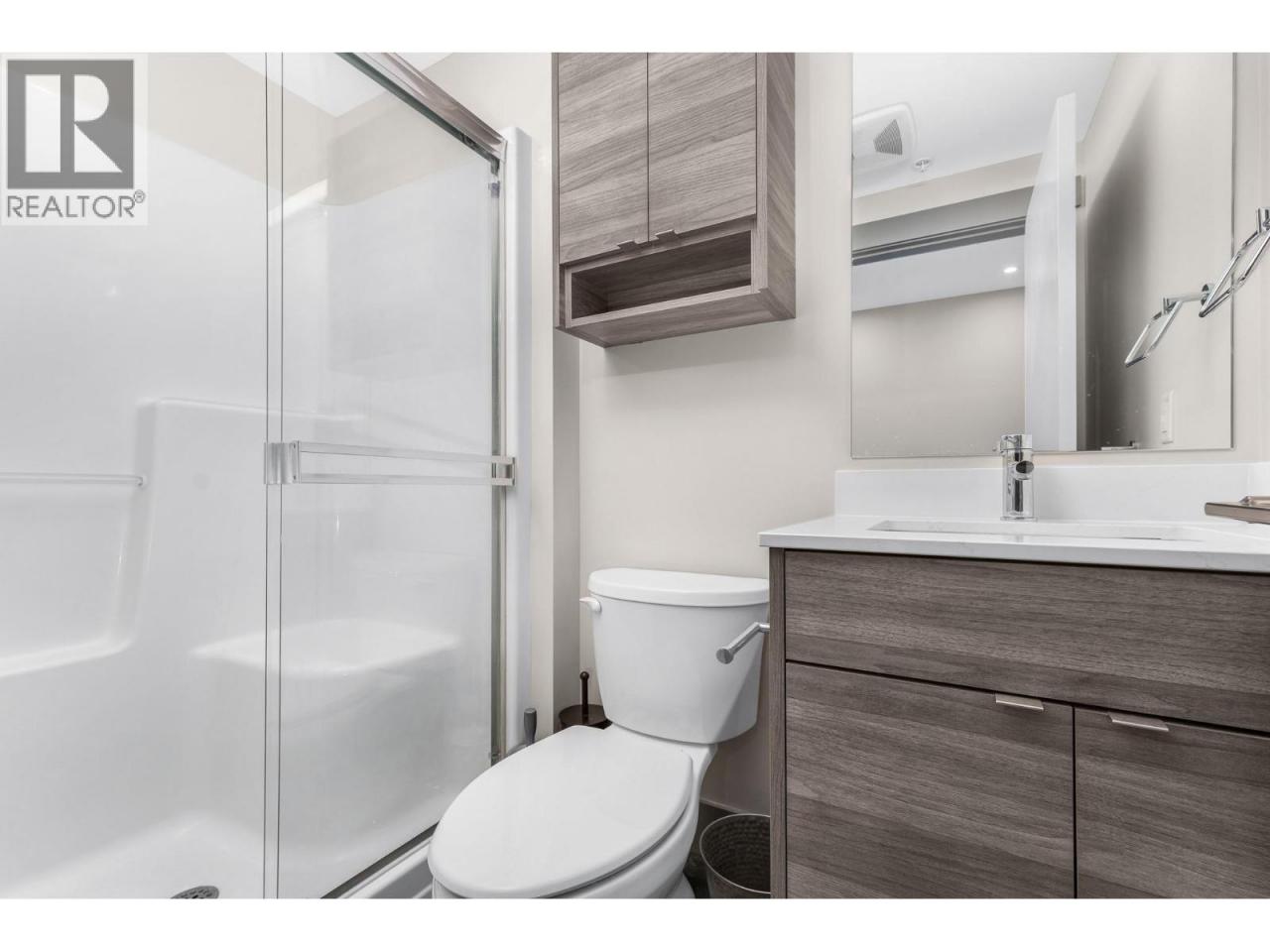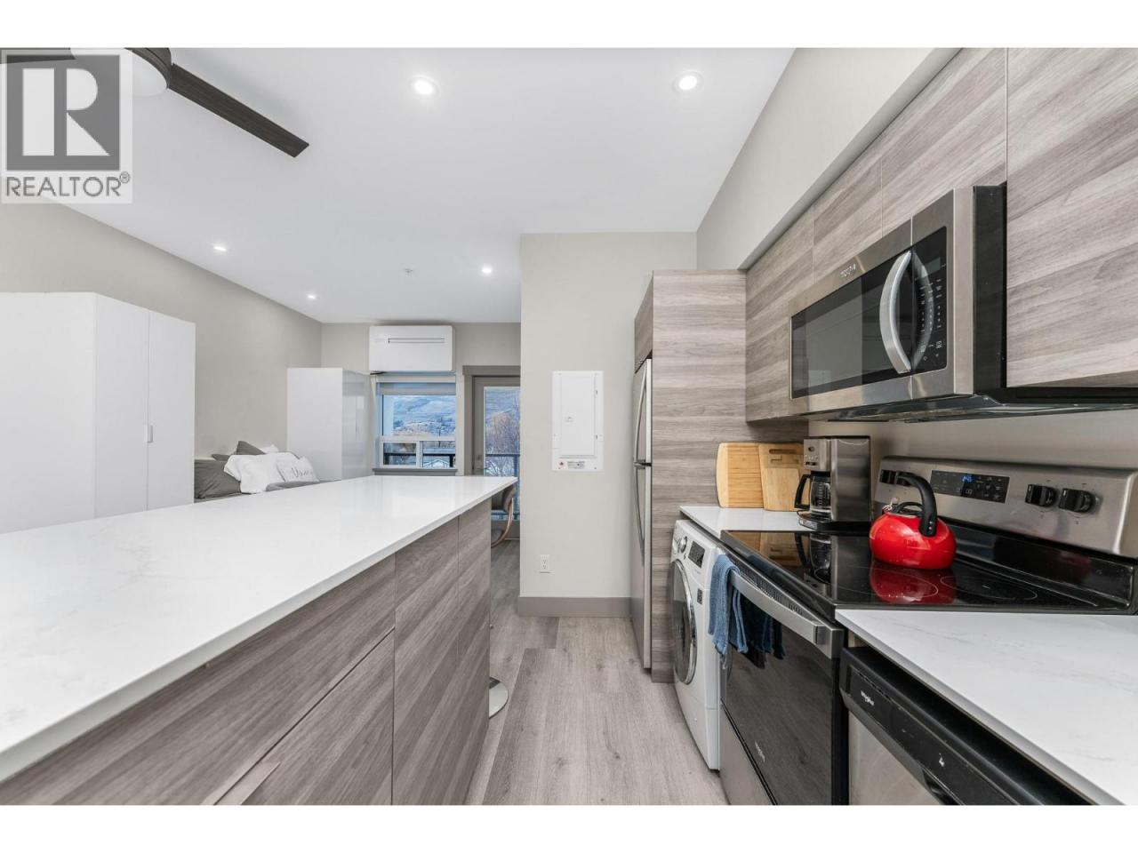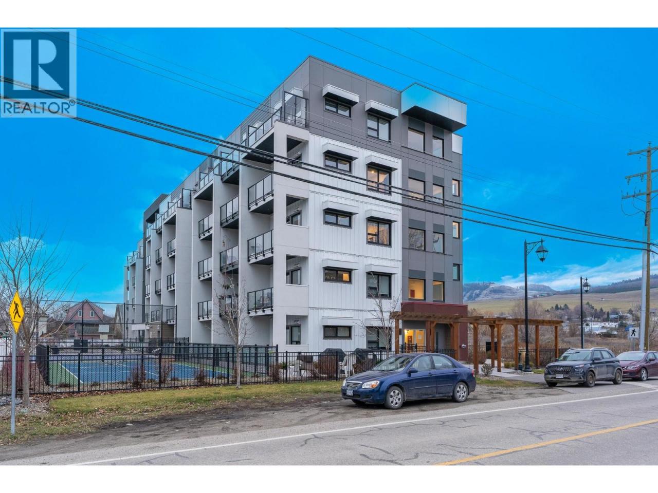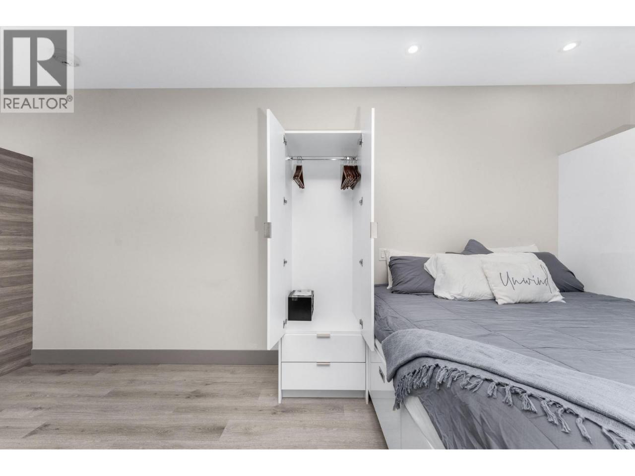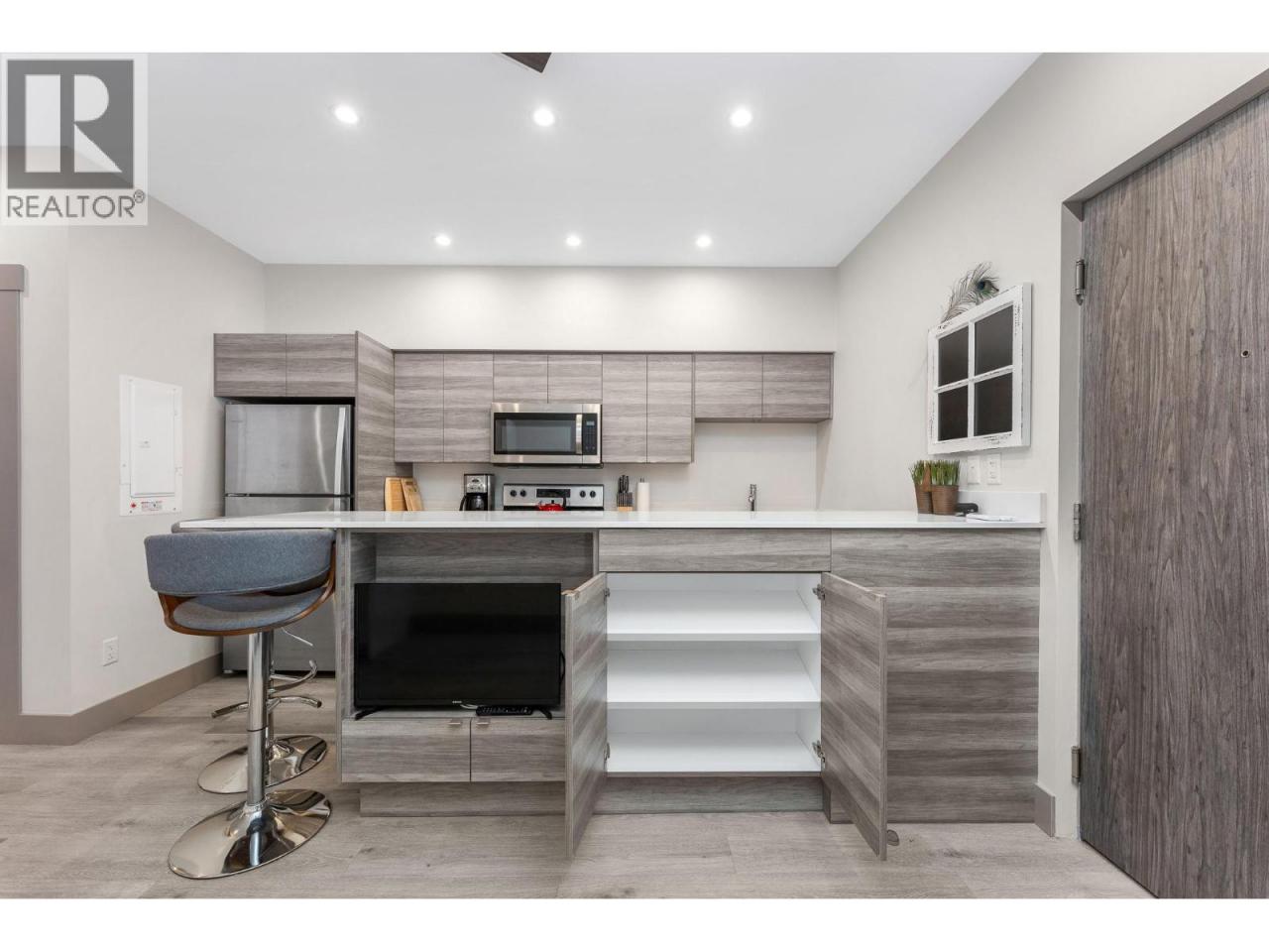 A pied-a-terre, a get-away location for summer and winter fun or an early toe-hold in the exciting world of home ownership -- this affordable and incredibly well designed micro unit is a great consideration. Built in 2021 just across the road from a well-kept public beach (Kin Beach) this development features a pool, gym, pickle-ball courts, community BBQ and EV charging stations. Inside, the Unit comes with everything you need to live - bedding, dining and kitchenware etc. Practical vinyl plank flooring, an awesome King size bed and cleverly designed storage. You have in-suite laundry with the latest in small space convenience - a washer-dryer combo designed to wash and dry clothes in the same drum! And then for bigger loads there is a coin operated laundry unit on the 3rd floor. The only thing inside this unit doesn't have is a sofa because the tenant said the original wasn't comfortable! So now all you need to do is invest in your own comfortable sofa and you have a truly compact and functional home! In addition, there is a 6'x4'x6' locker conveniently located on the same floor. Outside you have north-west facing massive deck (14'x 4'6"") with beautiful lake views for those summer evenings. And … the strata fees are reasonable at $282 per month. Oh and one more important thing -- unlike nearly every condo in Vernon, the Vita allows short term rentals -- see supplement for details. (id:6769)