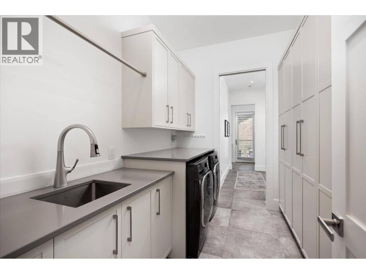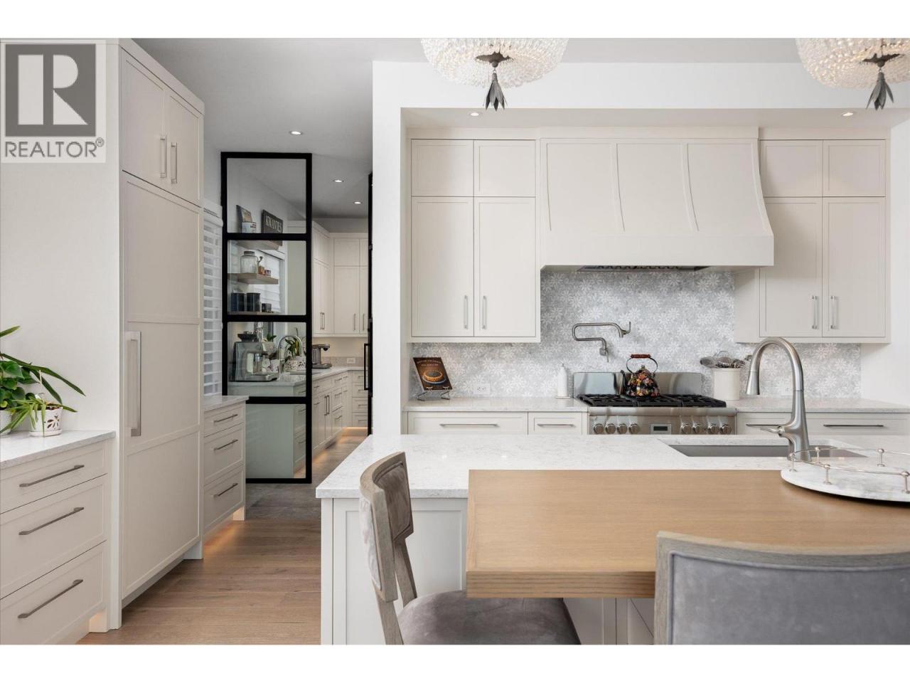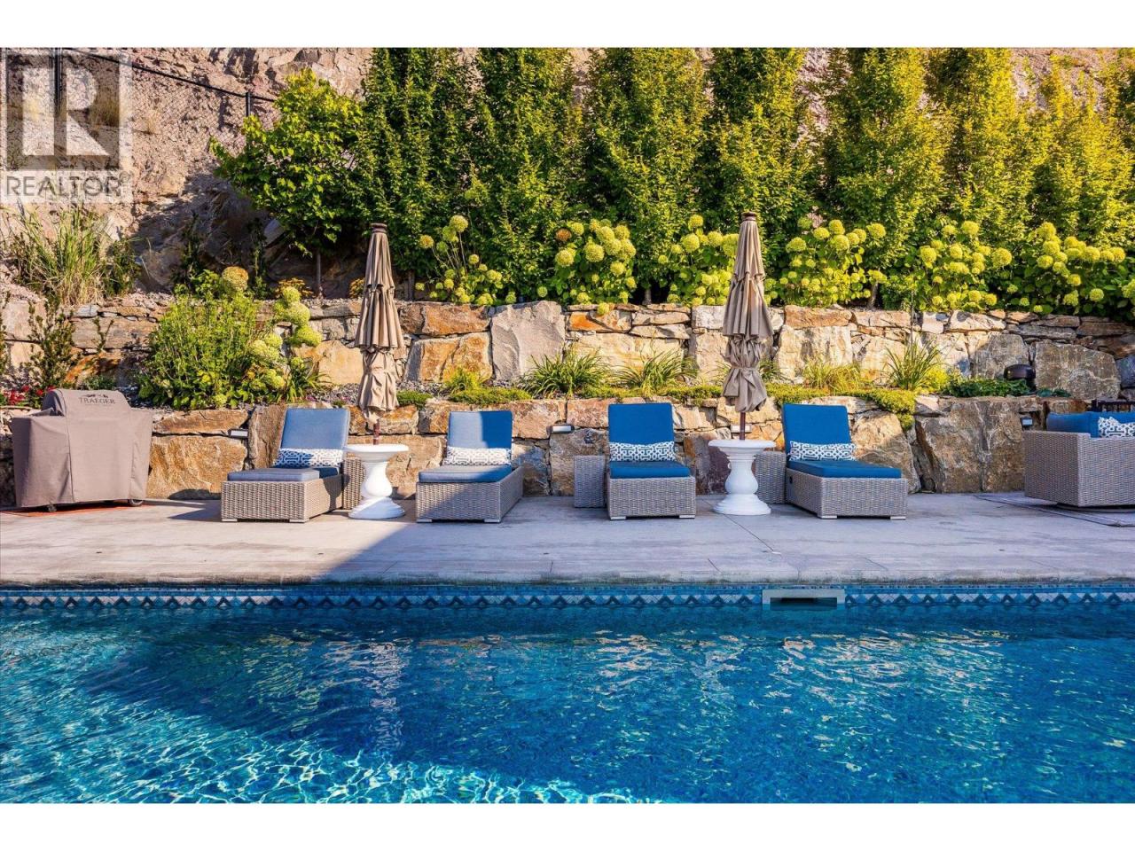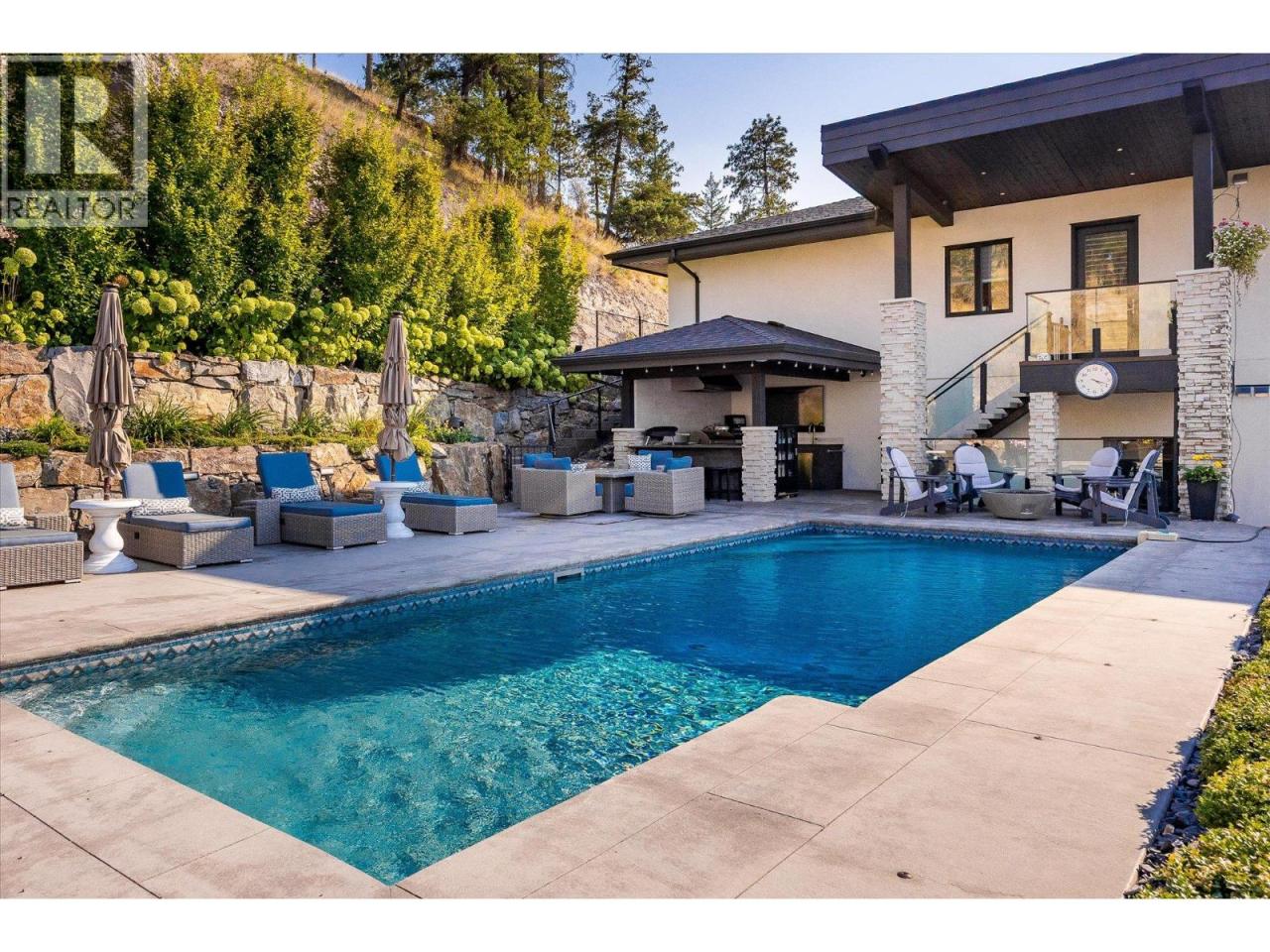 NEW PRICE!! Located in one of Kelowna’s most desirable neighborhoods, this property captures 180-degree panoramic views of the lake and mountains. Set on a quiet cul-de-sac, it offers rare privacy while remaining just minutes from downtown, wineries, golf, restaurants, and all the best of Okanagan living. The open-concept main level seamlessly connects indoor and outdoor living. A chef’s kitchen, designed by Carolyn Walsh, features a Thermador six burner range, two panelled fridges and dishwashers, a panelled freezer along with a striking two-tone island. A new working pantry and custom wine room elevate the home’s entertaining potential. Two primary suites provide private retreats with spectacular lake views. The main-level suite includes a fireplace sitting area and spa-inspired ensuite with a curbless steam shower. The lower-level suite mirrors the same luxury finishes, offering flexibility for guests or family. Designed for entertaining, the lower level also boasts a twelve seat theatre, wet bar, and recreation space, with a separate entrance for guests. Lower level radiant in-floor heating keeps every space warm and inviting. Resort-style outdoor living awaits with a saltwater pool, pool bath, artificial turf yard, and an outdoor kitchen - ideal for summer gatherings. Combining luxury, functionality, and effortless living, this home also grants direct access to Knox Mountain Park and Kelowna’s outdoor lifestyle. With its privacy and breathtaking views, this property delivers the quintessential Okanagan experience. (id:6769)
