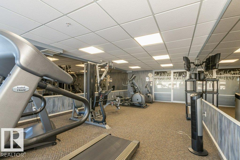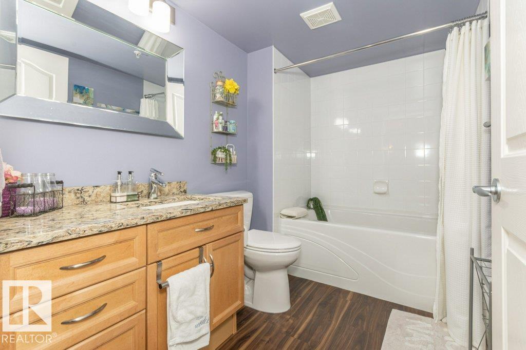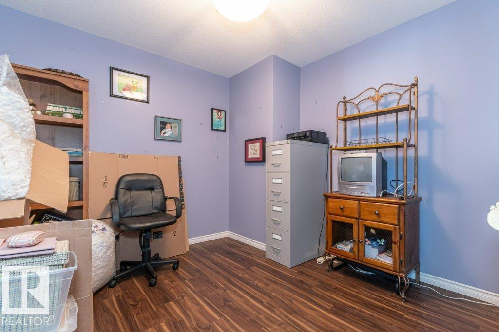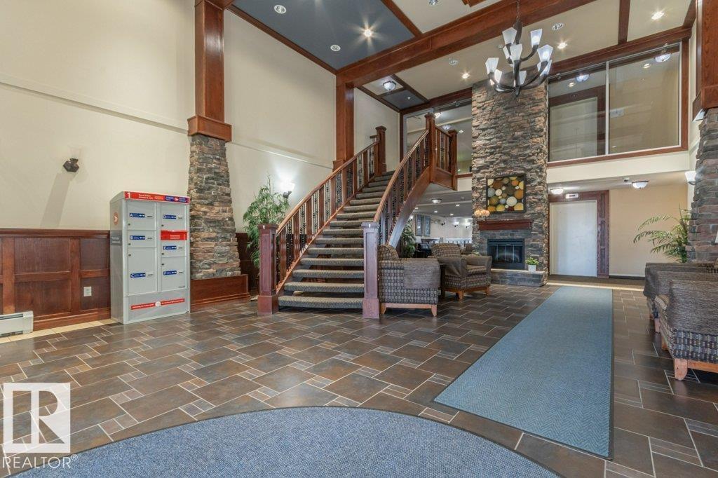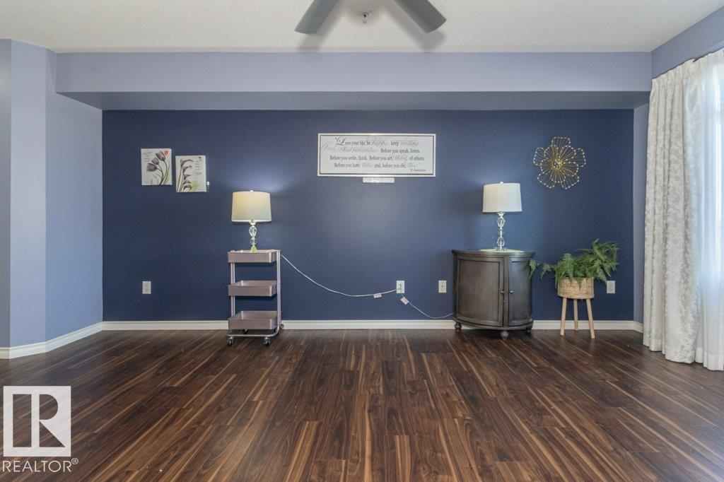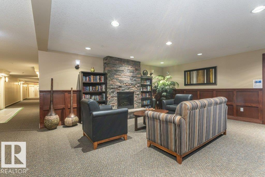 Welcome to Glastonbury Village, an established adult living (18+) community conveniently located on Edmonton’s west side steps from public transportation, parks, trails, shopping and more! The building welcomes you with a grand foyer that leads to the social room on the main level, and up the curved stairs to the guest suite + fitness room on the 2nd level. This updated and loved home feat. a very desirable 2 bdrm PLUS den layout! Home features include an open plan w/updated vinyl plank floors, warm colours, and renovated kitchen w/newer SS appl. (inc. full-size fridge), updated cabinets, stone counters + tile backsplash. There are 2 bdrms that are a very nice size, with the master suite featuring his + her closets and a 3pc ensuite w/large walk-in shower. Completing the plan is a spacious living/dining area w/corner gas F/P, den/office + laundry/storage room. West facing balcony with sunset and community views. Home comes with A/C, 1 titled U/G parking stall and storage cage. Well managed building. (id:6769)