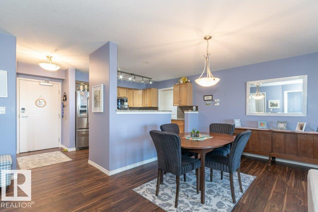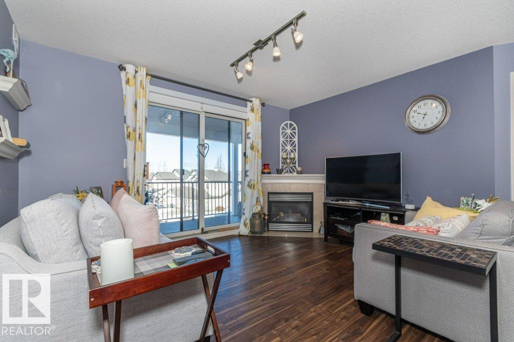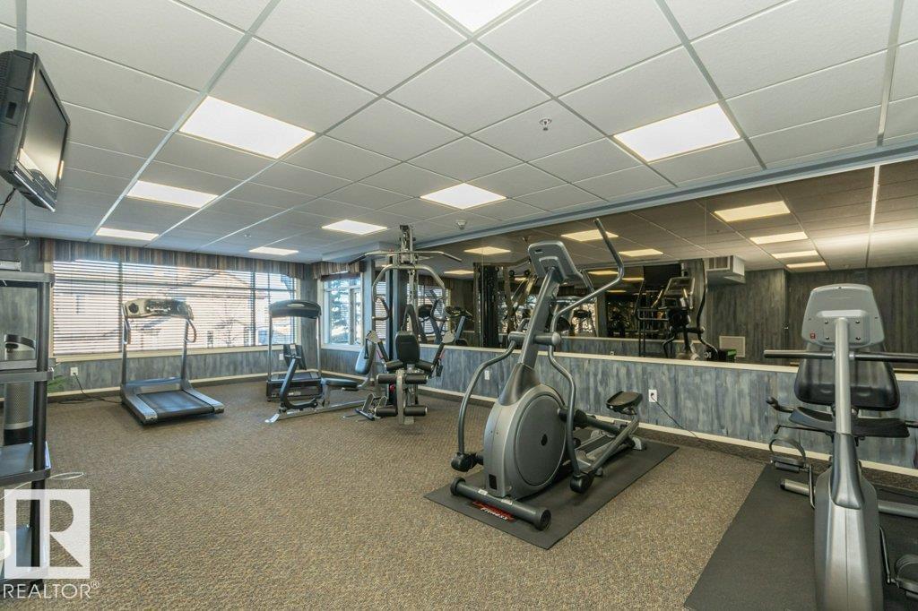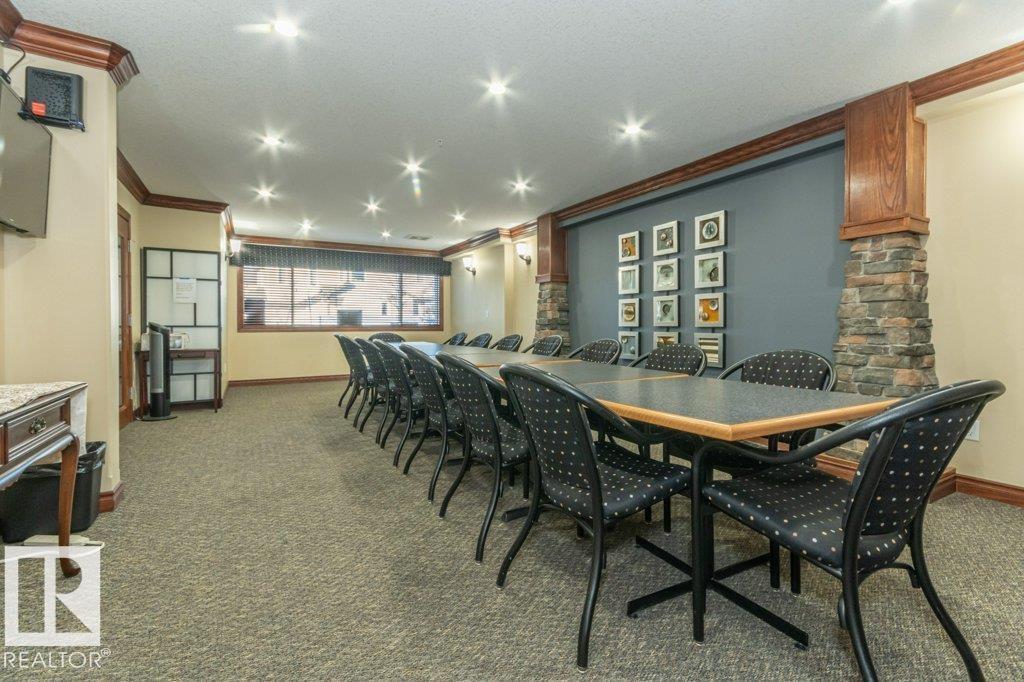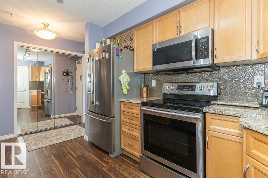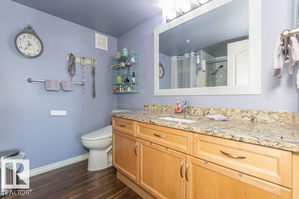 Welcome to Glastonbury Village, an established adult living (18+) community conveniently located on Edmonton’s west side steps from public transportation, parks, trails, shopping and more! The building welcomes you with a grand foyer that leads to the social room on the main level, and up the curved stairs to the guest suite + fitness room on the 2nd level. This updated and loved home feat. a very desirable 2 bdrm PLUS den layout! Home features include an open plan w/updated vinyl plank floors, warm colours, and renovated kitchen w/newer SS appl. (inc. full-size fridge), updated cabinets, stone counters + tile backsplash. There are 2 bdrms that are a very nice size, with the master suite featuring his + her closets and a 3pc ensuite w/large walk-in shower. Completing the plan is a spacious living/dining area w/corner gas F/P, den/office + laundry/storage room. West facing balcony with sunset and community views. Home comes with A/C, 1 titled U/G parking stall and storage cage. Well managed building. (id:6769)