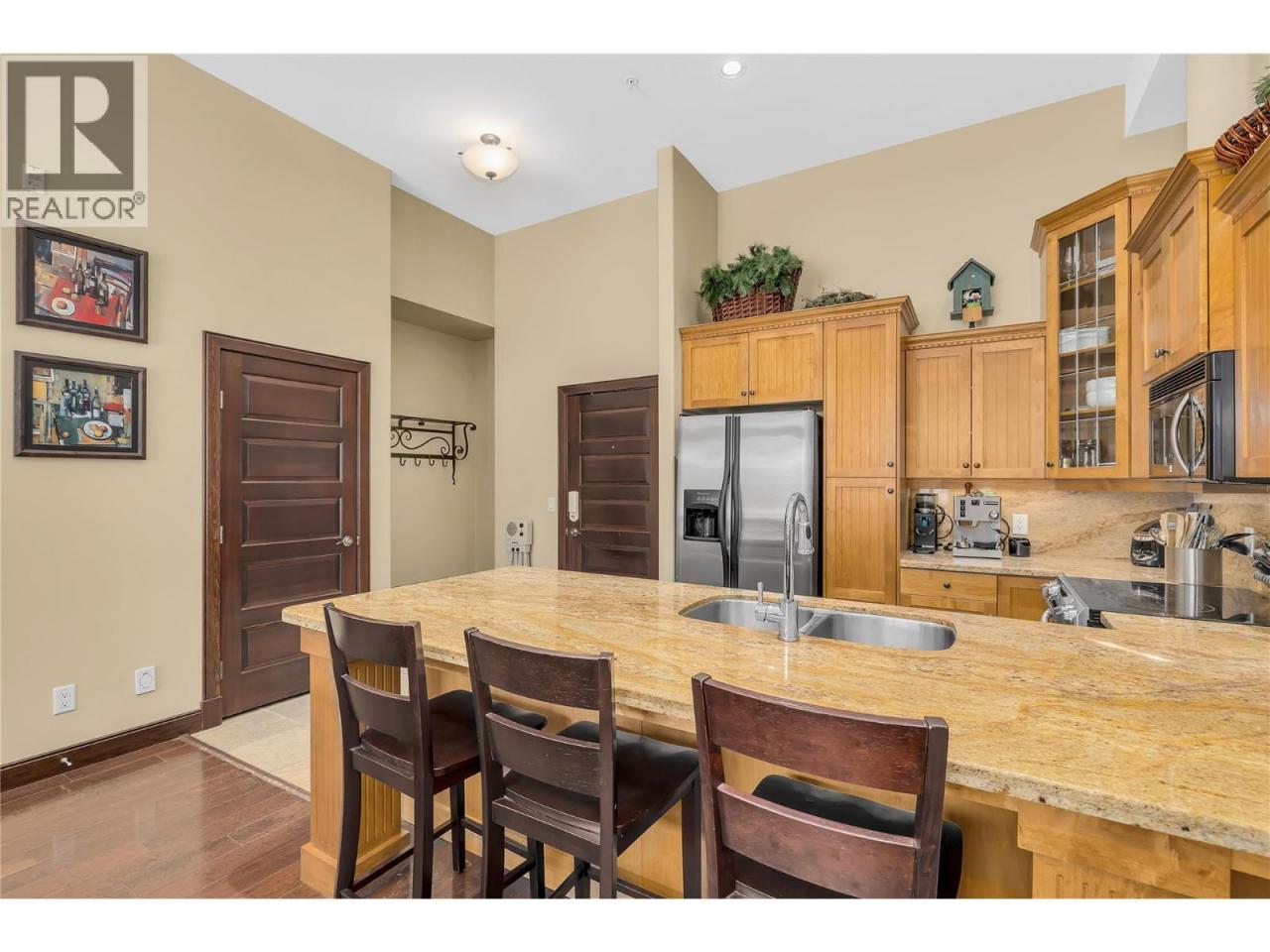 This beautifully appointed three bedroom, two bathroom condo boasts twelve foot ceilings and is fully furnished with exquisite furniture and decor, creating a cozy and inviting mountain retreat. Turn-key and year to go for this winter season. Located directly on the ""Sun Run"" with unbeatable ski access to four major chairlifts. Relax on your covered deck with a private hot tub overlooking the slopes, offering the perfect spot to unwind after a day on the mountain. Additional features include underground parking, making it easy to arrive and hit the slopes, in-unit laundry for added convenience, hardwood, granite, stainless appliances, maple cabinetry, beverage center with fridge, wine storage behind a custom iron gate, heated slate flooring in entryway and both bathrooms. GST paid and this unit has never been rented, it shows like new! Well run strata with full time building manager year round. Don’t miss this opportunity to own a piece of Big White’s finest ski-in/ski-out real estate! With direct flights from cities like Los Angeles, Toronto, and Montreal, and just an hour from Kelowna International Airport, Big White is more accessible than ever. Known for some of the best snow in North America, this resort offers a winter wonderland experience. Best of all, this property is fully exempt from the Foreign Buyer Ban, Foreign Buyers Tax, Speculation Tax, Empty Home Tax, and Short-Term Rental Ban, providing a rare opportunity for international buyers. LIVE WHERE YOU PLAY! (id:6769)