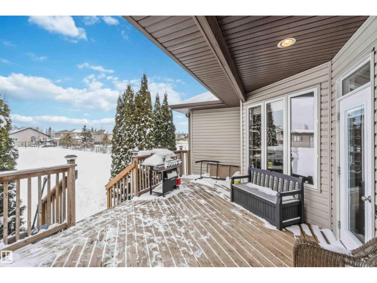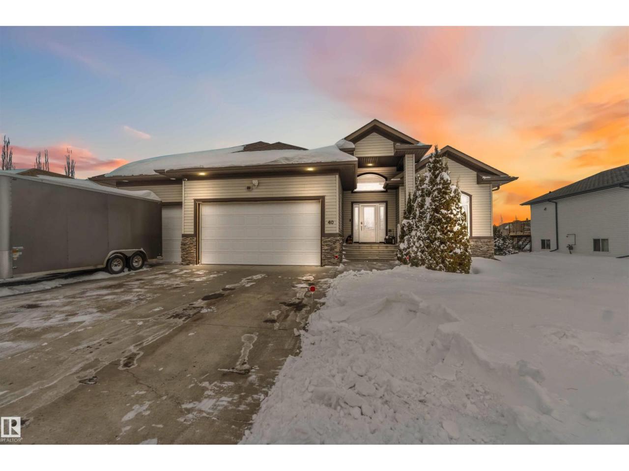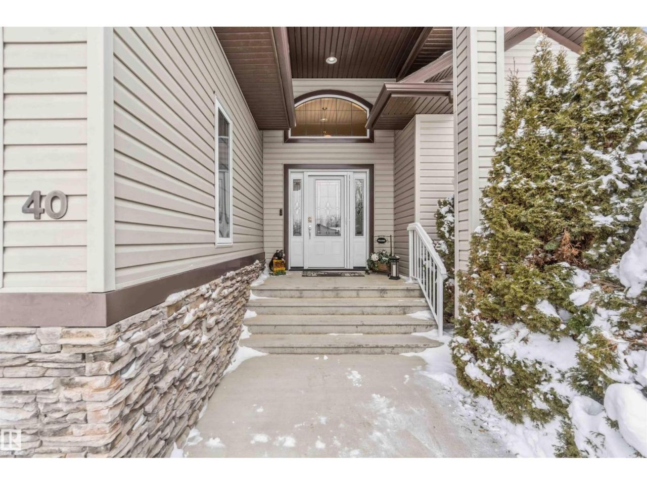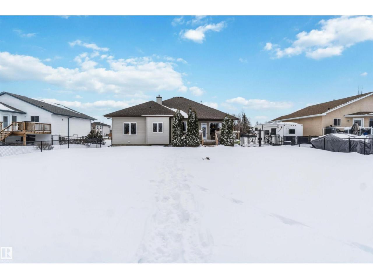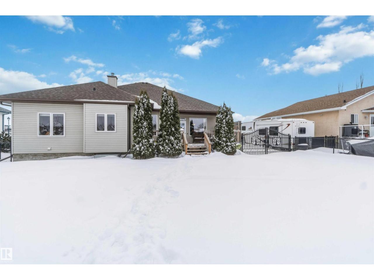 Look No Further! Welcome to 40 Landing Trails Dr in the Town of Gibbons. Stunning Bungalow on a 1/3+ acre lot with a Triple Heated Garage, large front driveway & over 2000sq ft of living space to enjoy! The main floor features 10ft ceilings, grand foyer, front den, living room with a gas FP & lots of natural light. Dining room, kitchen with cherry cabinets, granite countertops, island with an eat-up area, walk-in pantry, dining nook looking out to the private covered deck with natural gas for a bbq. The laundry room has access to the garage. 2 bedrooms, 4pc bathroom, primary bedroom with a huge walk-in closet, 4pc ensuite & soaker tub. The finished basement boats a rec room, 2 more bedrooms, 3pc bathroom & storage room. 2019 50yr Shingles, 2021 HE Furnace & HE HWT, 2022 Central AC & Radiant Furnace in garage. Garage has 8ft doors, floor drain, hot/cold taps. New iron gate allows access to the huge fenced yard, storage shed, raised garden beds & fire pit area. Impressive pride of ownership throughout!! (id:6769)