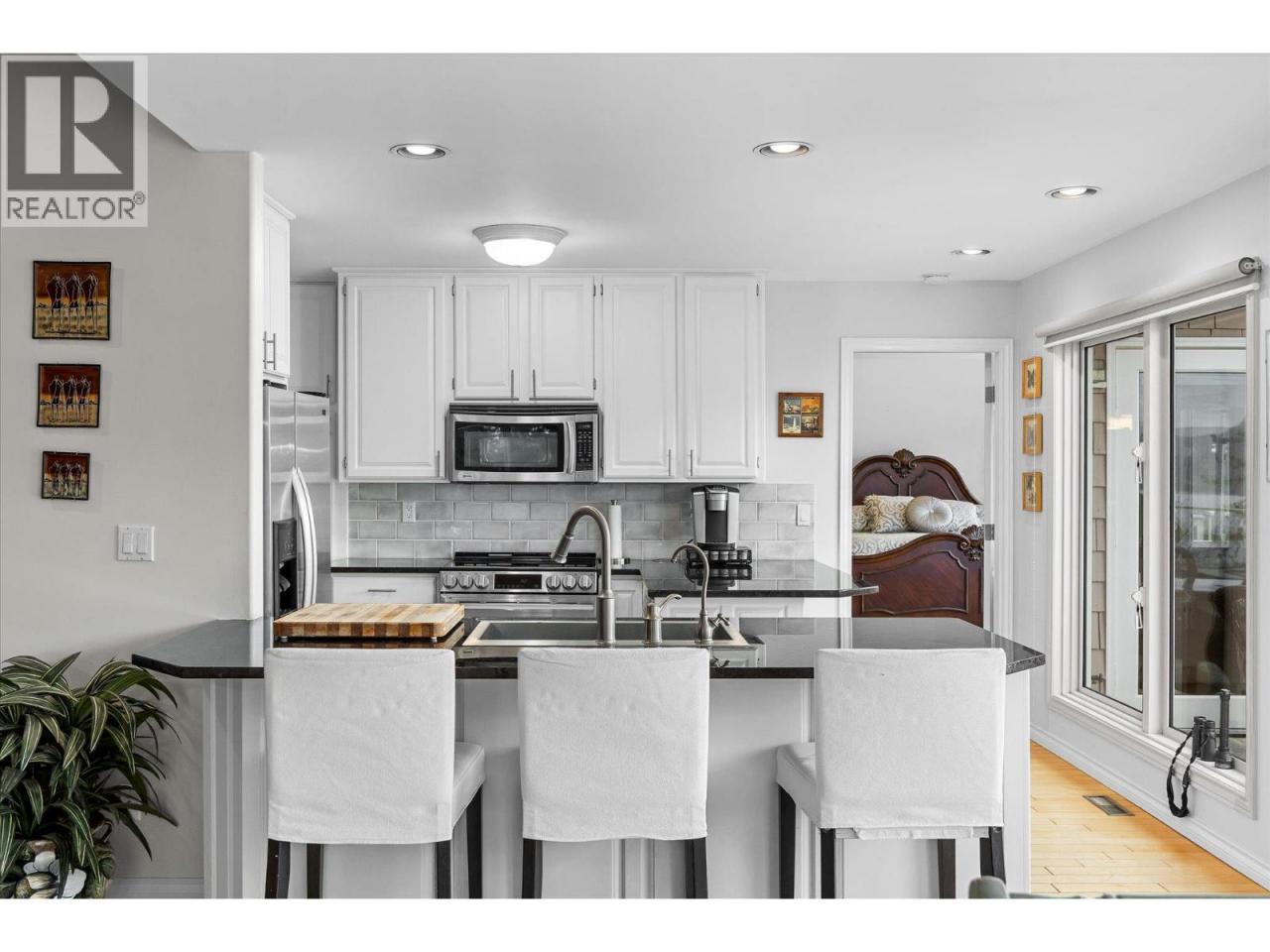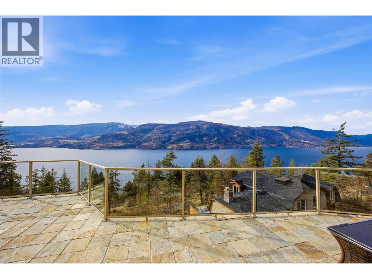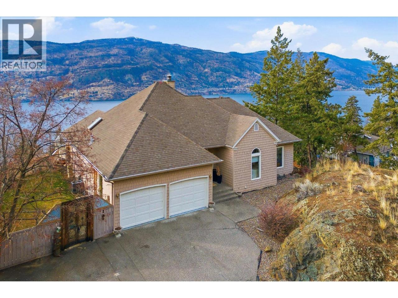 Priced below assessed value and Perched on a quiet private lane, this 3-bedroom, 2-bath walkout rancher offers breathtaking, unobstructed views of Okanagan Lake from its dramatic bluff setting. Designed to capture the scenery from nearly every angle, the home features vaulted ceilings, skylights, and oversized new windows that fill the space with natural light while framing stunning lake and mountain vistas. The open-concept living area is warm and inviting, highlighted by a wood-burning fireplace with exposed brick. The kitchen features granite countertops, stainless steel appliances, and a sleek tile backsplash. The primary suite enjoys spectacular views, a walk-in closet, and private ensuite. Two additional bedrooms are tucked into a separate wing, ideal for guests or a home office. The lower level offers abundant storage and flexible space perfect for additional sleeping quarters, a home gym, office, or creative workspace. Step outside to a large tiled sundeck with powered awnings, ideal for entertaining or relaxing while taking in the incredible scenery. A fenced yard space provides a great area for pets, gardening, or outdoor enjoyment. Located just 10 minutes from downtown Kelowna, this property offers a rare combination of privacy, views, and convenience. (id:6769)