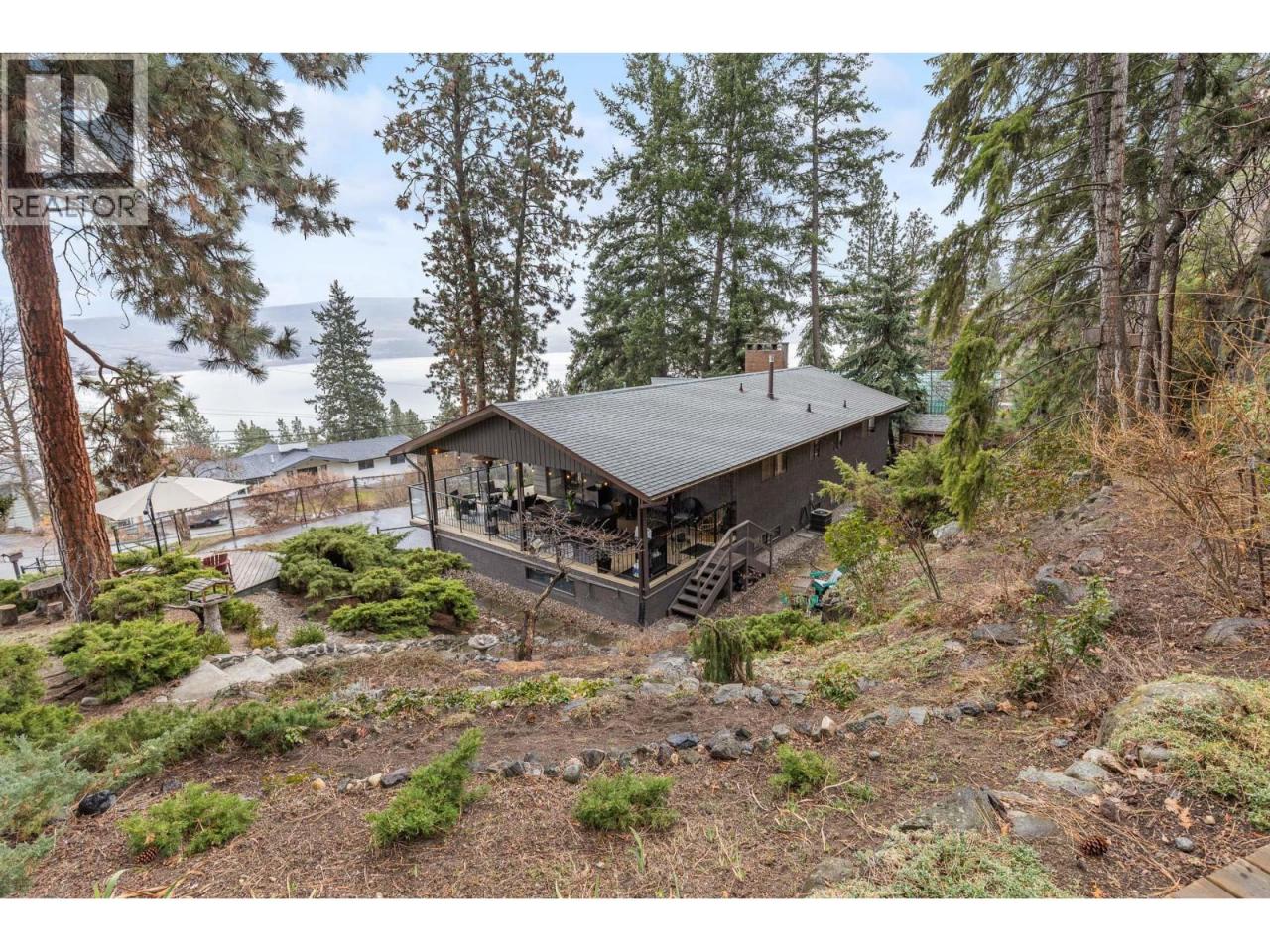OPEN HOUSE SATURDAY 1PM - 3PM. Unique and surrounded by nature, this home offers a private retreat setting where you can truly recharge and refresh—while still being close to everything. Set on a quiet no-thru road with mature trees on a 0.37-acre lot, enjoy lake and mountain views and the peace that comes with this tucked-away location. The home features 3 bedrooms and 3 baths, a living room with a gas fireplace, and a dining room with lake views. Directly off the eat-in kitchen, you'll step outside to the huge covered deck—ideal for relaxing, entertaining friends and family, and soaking in the views. Outside, you’ll appreciate the multiple private outdoor seating areas, thoughtfully integrated into the landscaping for privacy and connection to nature. A double car garage is complemented by a gated driveway with space for a small RV, offering excellent parking and flexibility. One of the best parts about living here is being close to Kalamoir Regional Park, a local favourite for lakeside trails, beach time, and peaceful walks along the water. You’re also just minutes from the Westside Wine Trail, perfect for spontaneous tastings and patio afternoons. Click 3D Tour Link for all photos, house walkthrough and downloadable floorplans. (id:6769)
