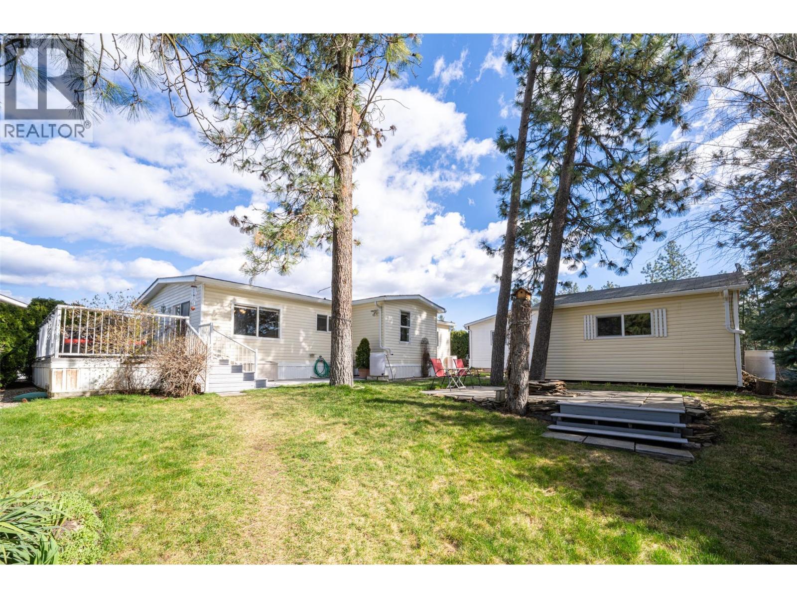 This is an exceptionally well-maintained 2-bedroom plus den, 2-bathroom manufactured home. The property has been meticulously cared for and remains in excellent condition. The interior features a spacious open-concept kitchen with ample cupboards, storage and four pull-out cupboard shelves. Both bathrooms include modern fixtures and granite countertops. The home is drywalled with new vinyl plank flooring throughout and large windows providing a bright atmosphere and a relaxing enclosed porch. Significant upgrades include a 35-year roof (installed in 2014), a water softener and reverse osmosis system, a newer hot water tank, and a new dishwasher. The exterior offers a large private yard and a sundeck with views of Okanagan Lake and Spall Golf Course. The grounds include a fire pit, multiple garden areas with perennials, and an automated watering system. Additionally, the property provides a 12' x 16' workshop, a storage shed, and ample parking for both vehicles and an RV. (id:6769)