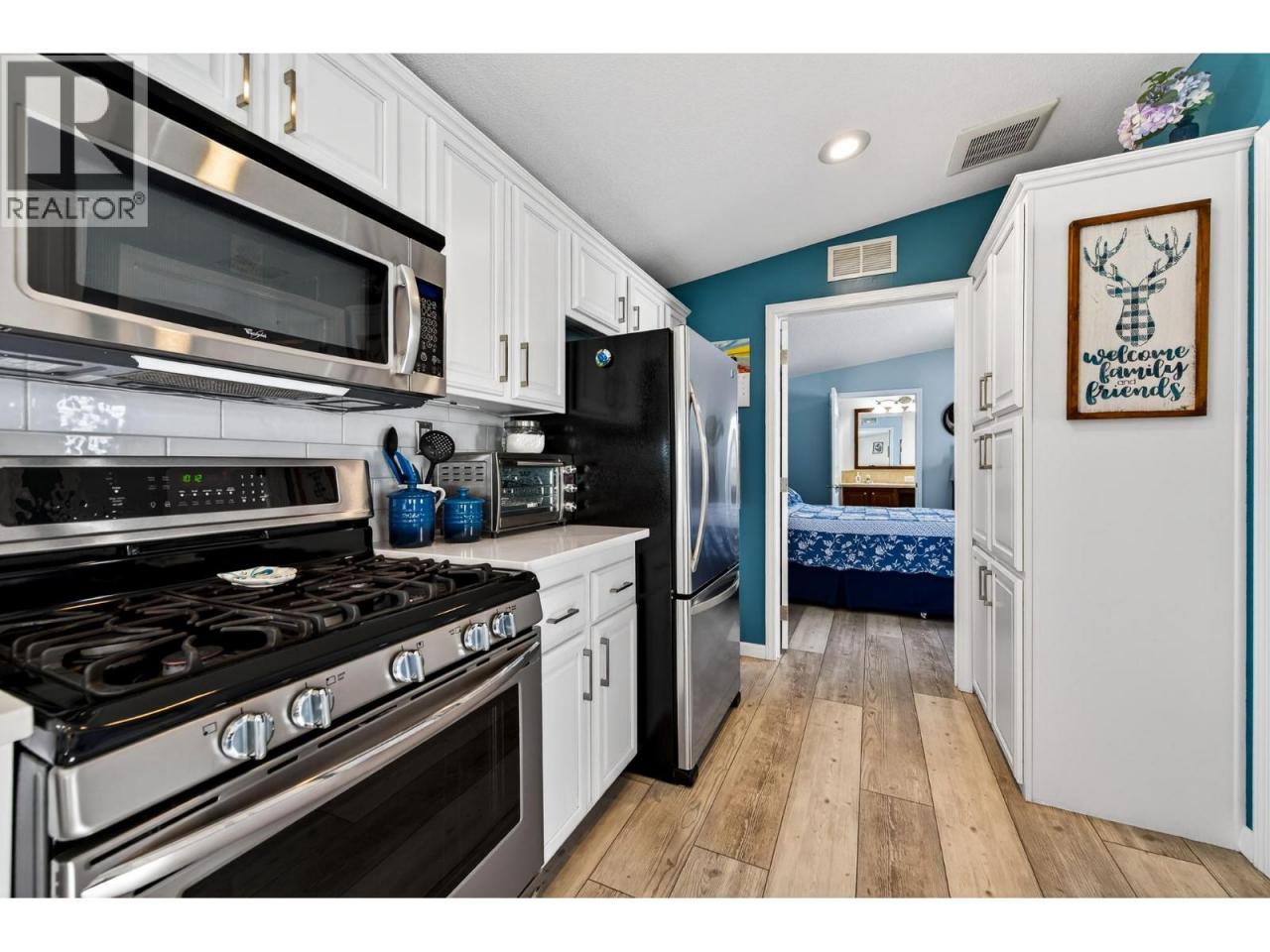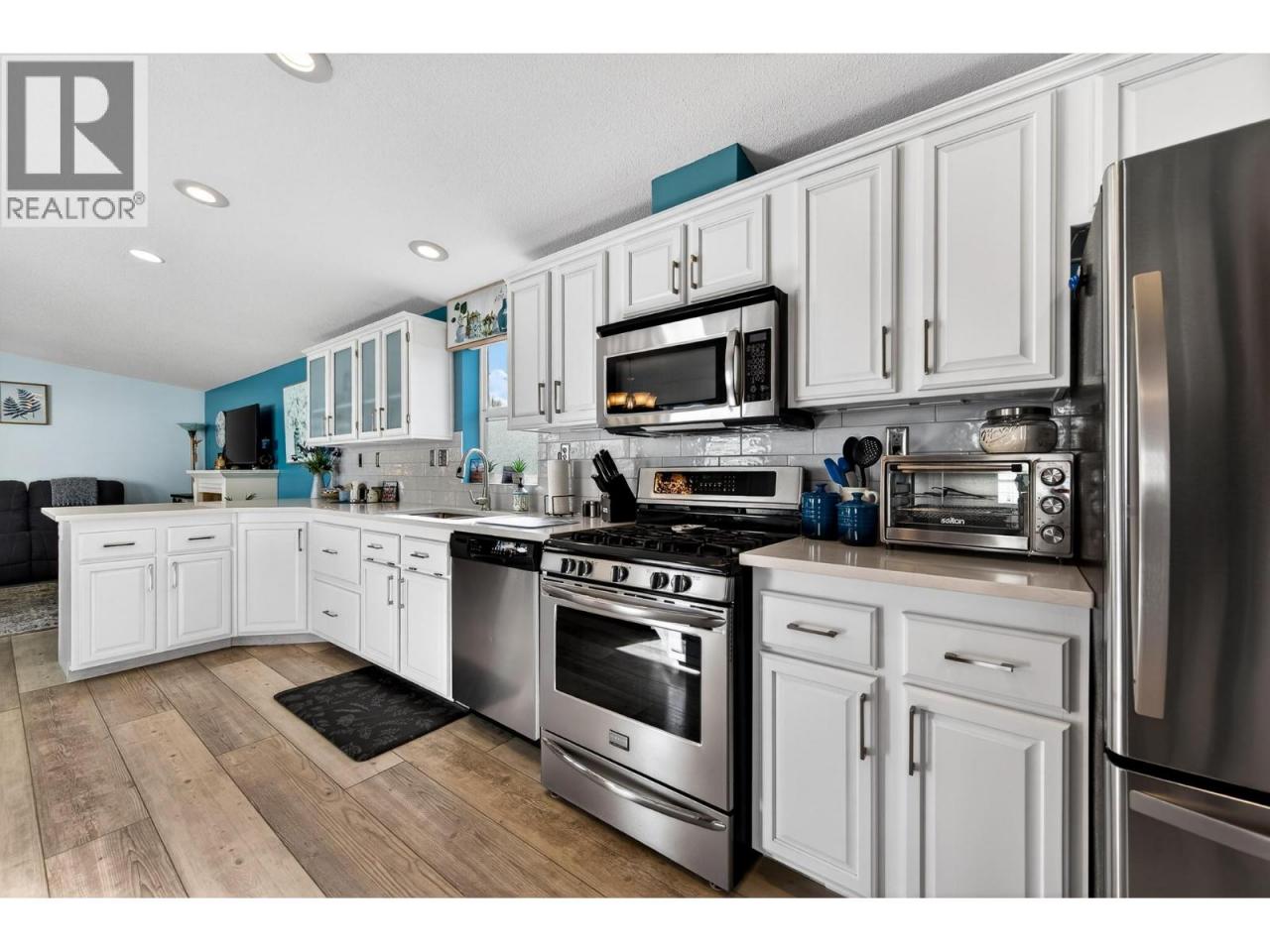 This beautifully updated 2-bedroom, 2-bathroom modular home offers bright, modern living with a spacious layout and numerous upgrades throughout. The kitchen features white cabinetry, tiled backsplash, stainless steel appliances including a gas range, quartz countertops, and excellent storage. The home is finished with newer vinyl flooring and fresh paint, and is filled with natural light from abundant windows. The inviting living room includes a cozy gas fireplace, and the primary bedroom offers a 3-piece ensuite with a tiled shower. Outside, enjoy a well-designed yard with a storage shed, garden boxes, grassed area, and attractive landscaping within a fully fenced space. Additional updates include a new furnace (2026) and a 4-year-old hot water tank. Located in a well-maintained park close to amenities, this home is move-in ready and full of charm. All meas approx. (id:6769)